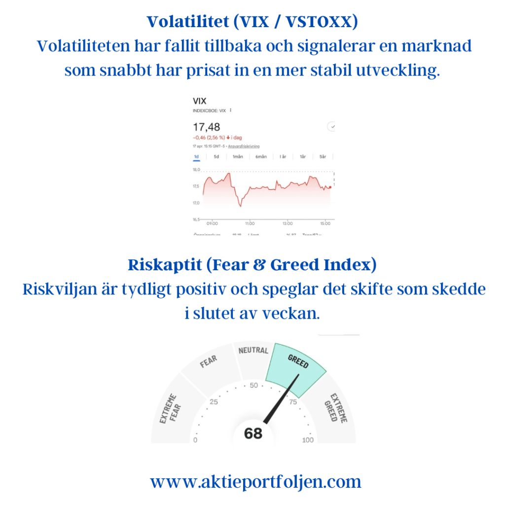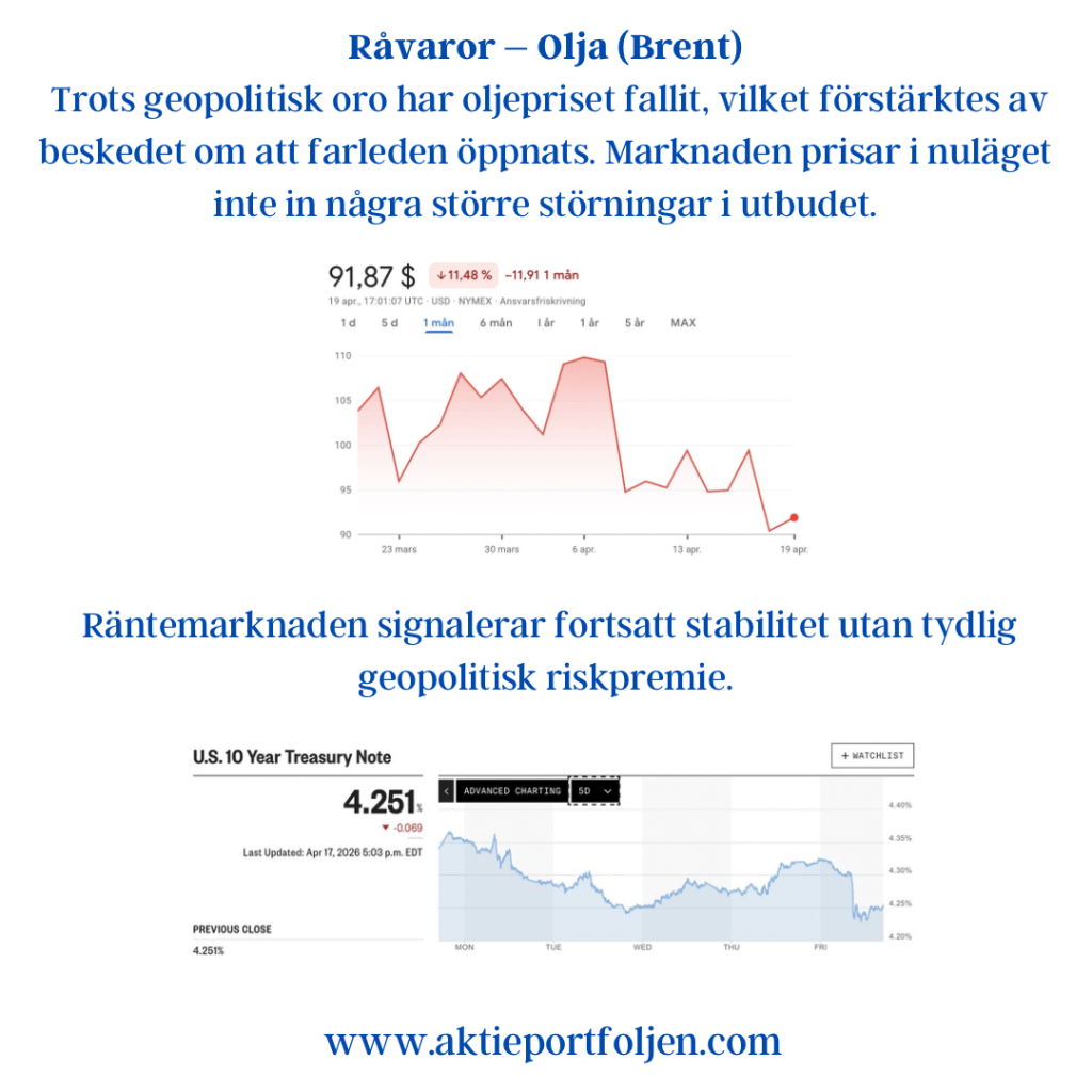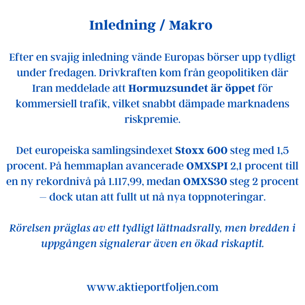 Efter en svajig inledning vände Europas börser upp tydligt under fredagen. Drivkraften kom från geopolitiken där Iran meddelade att Hormuzsundet är öppet för kommersiell trafik, vilket snabbt dämpade marknadens riskpremie.