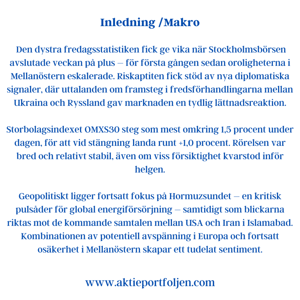 Geopolitiskt ligger fortsatt fokus på Hormuzsundet – en kritisk pulsåder för global energiförsörjning – samtidigt som blickarna riktas mot de kommande samtalen mellan USA och Iran i Islamabad. Kombinationen av potentiell avspänning i Europa och fortsatt osäkerhet i Mellanöstern skapar ett tudelat sentiment.