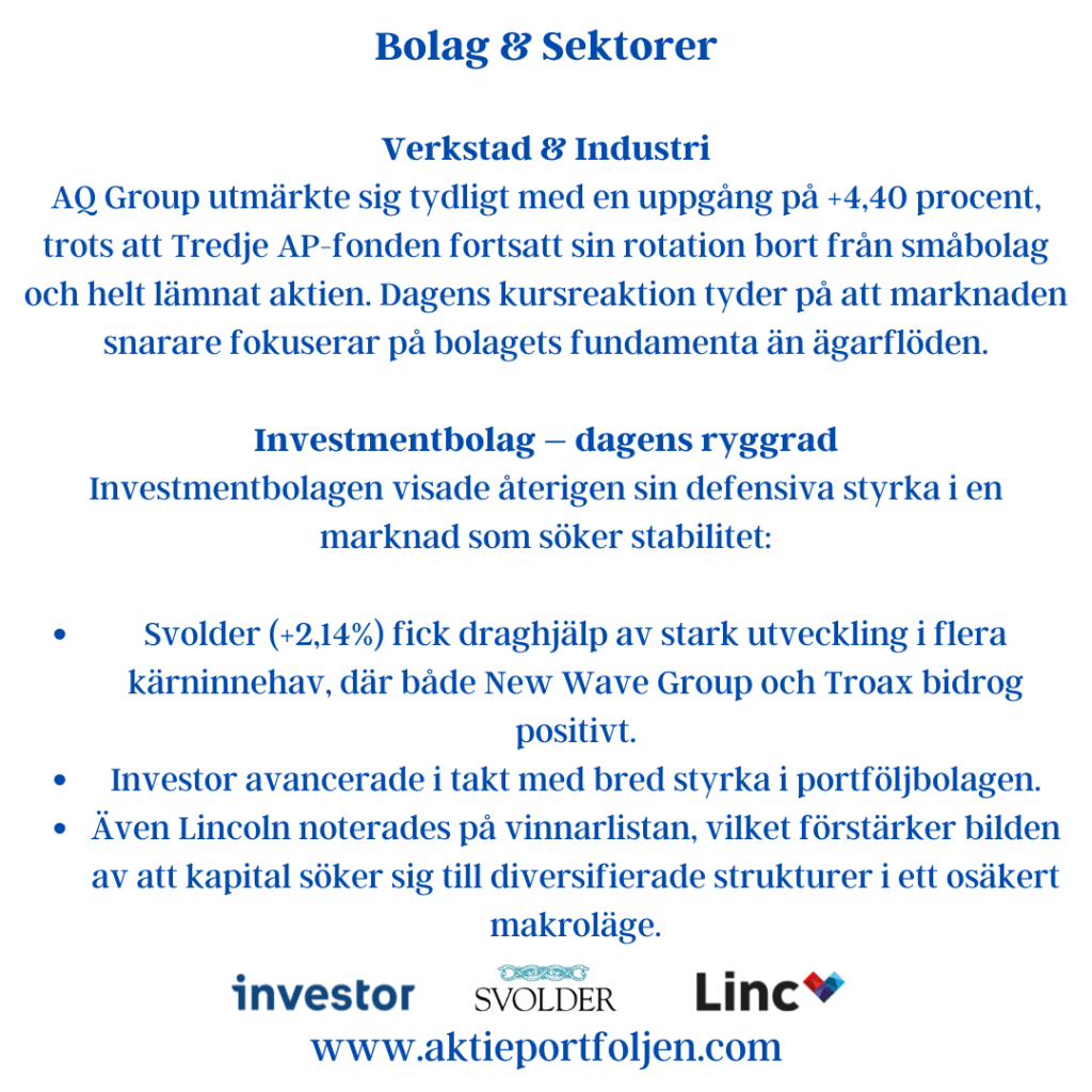 AQ Group utmärkte sig tydligt med en uppgång på +4,40 procent, trots att Tredje AP-fonden fortsatt sin rotation bort från småbolag och helt lämnat aktien. Dagens kursreaktion tyder på att marknaden snarare fokuserar på bolagets fundamenta än ägarflöden.