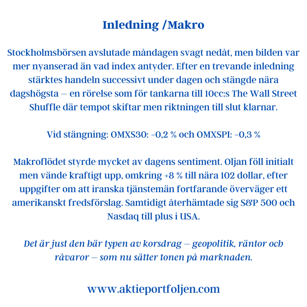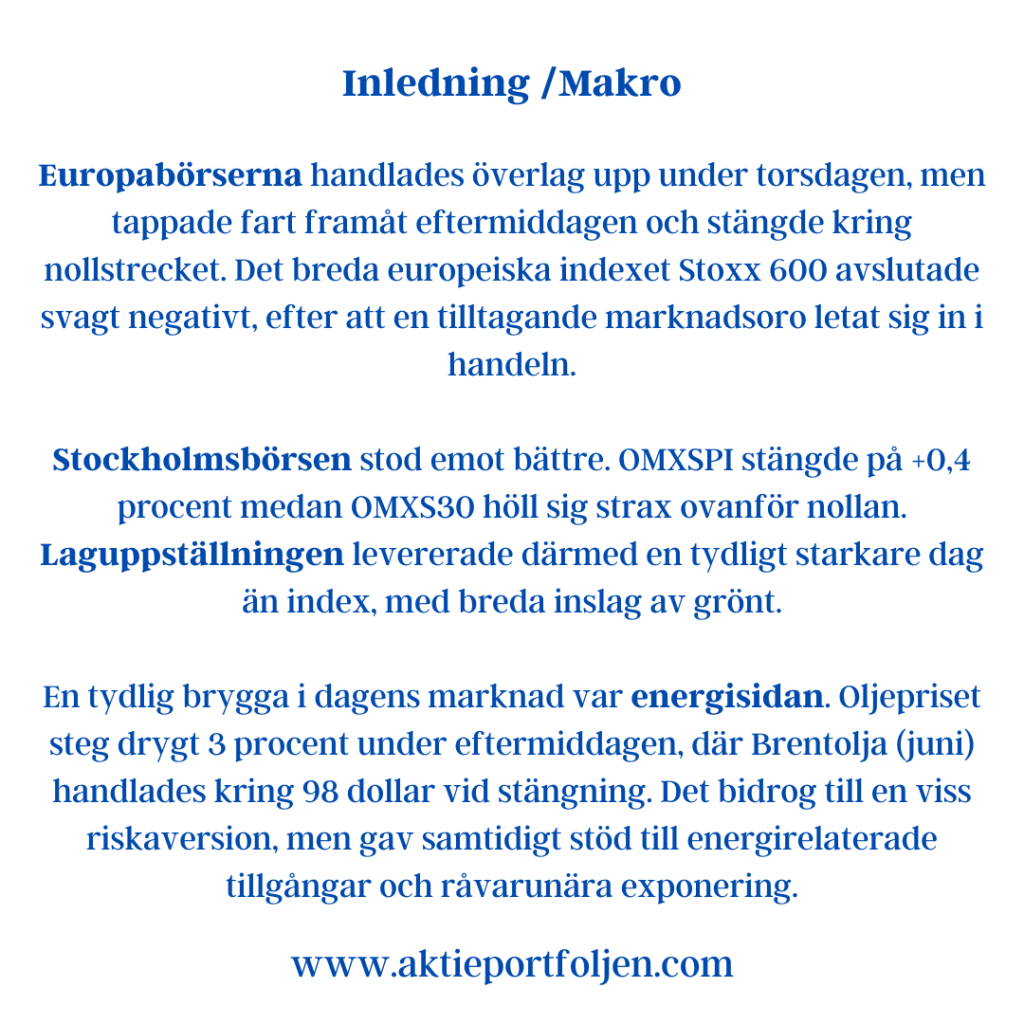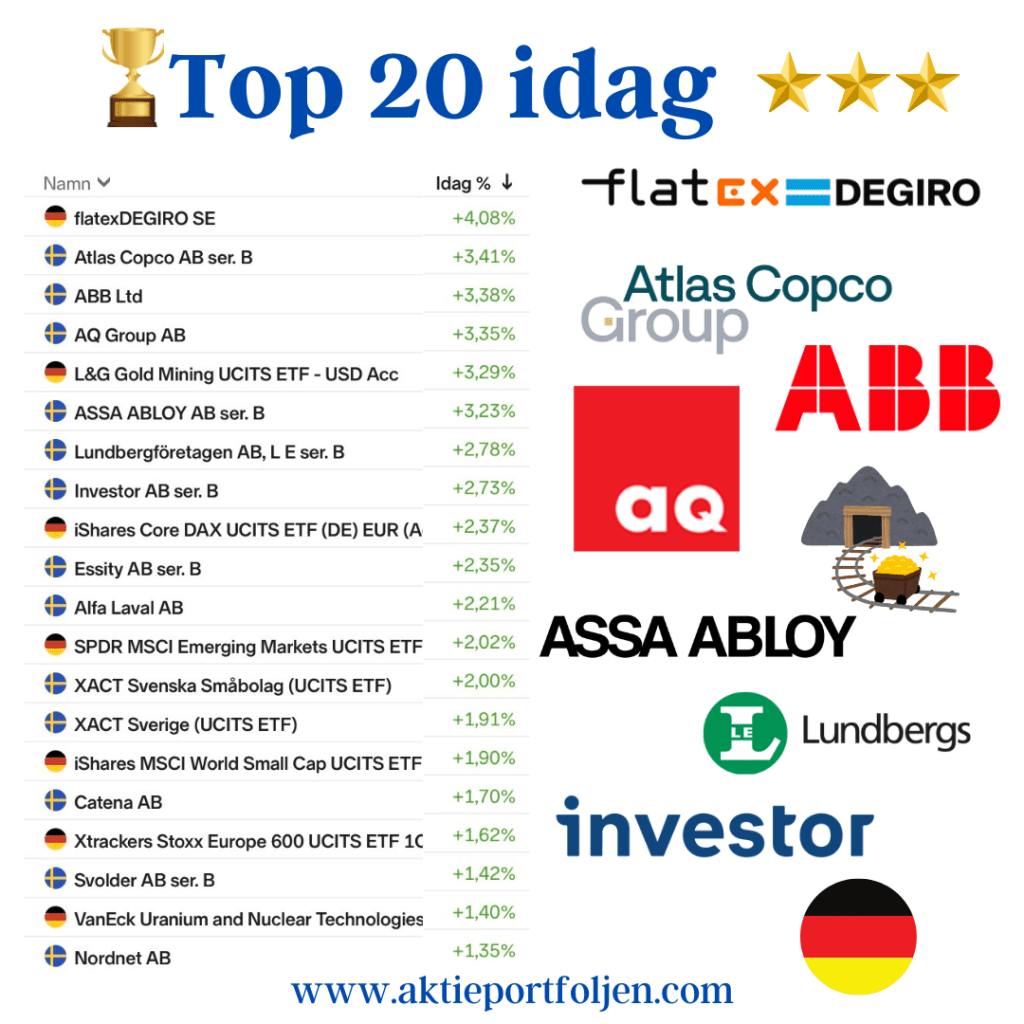Dagens vinnare toppades av flatexDEGIRO (+4,08%), som nu har stigit omkring 18 procent den senaste månaden. Uppgången speglar ett ökat intresse för aktiehandel och riskexponering, och riktar blickarna mot kommande rapport i nästa vecka.