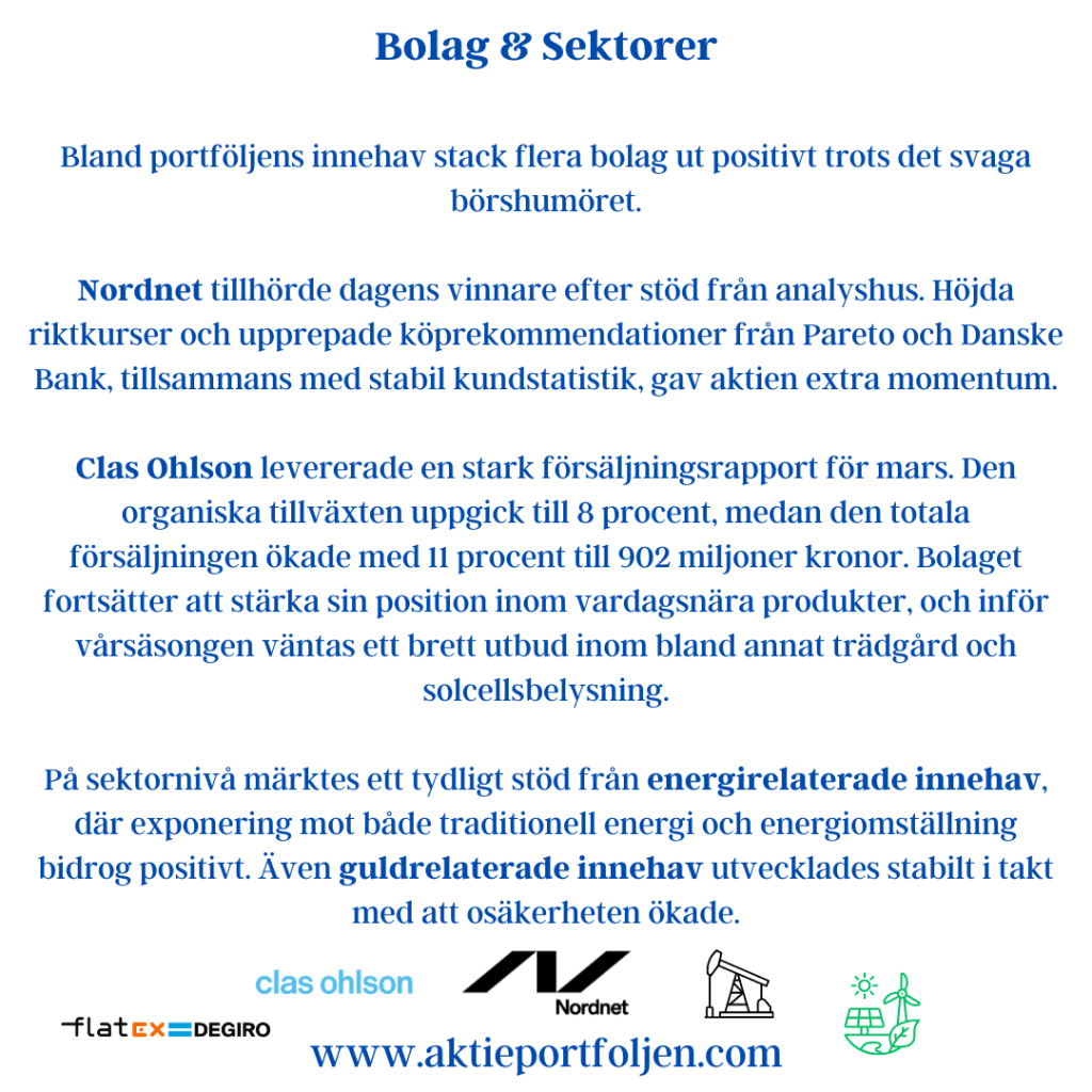 Svolder (+2,14%) fick draghjälp av stark utveckling i flera kärninnehav, där både New Wave Group och Troax bidrog positivt. Investor avancerade i takt med bred styrka i portföljbolagen. Även Lincoln noterades på vinnarlistan, vilket förstärker bilden av att kapital söker sig till diversifierade strukturer i ett osäkert makroläge.