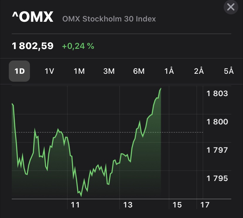 Skall OMX30 lyckas etablera sig över 1800? Åtminstone är vi där i detta nu. Återstår att se om köparna fortsätter lyfta OMX.