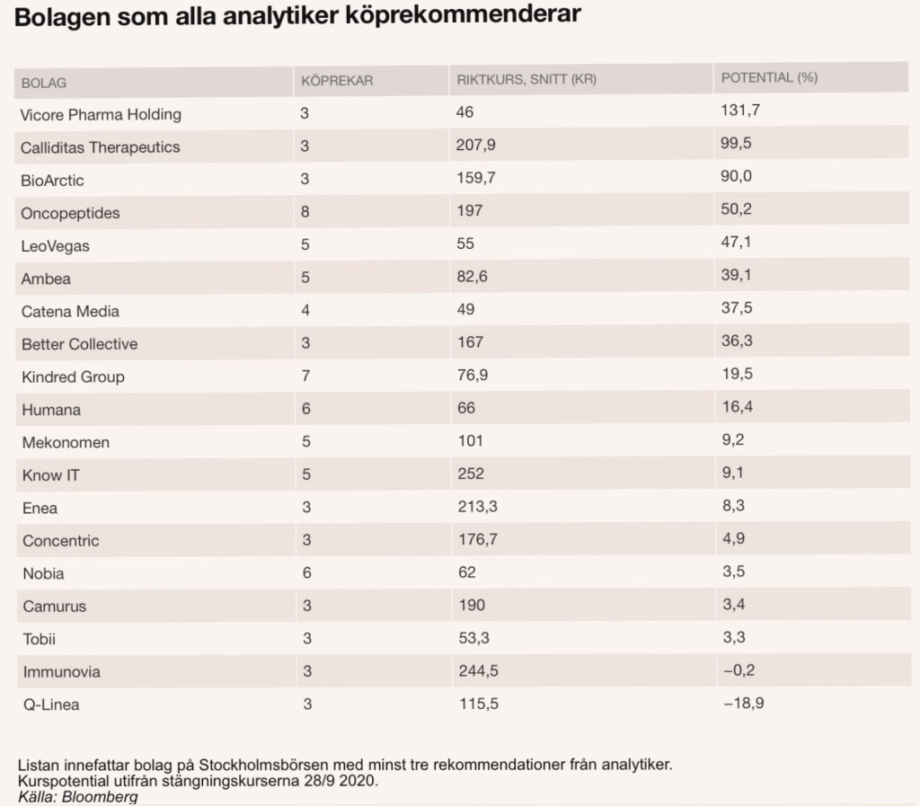 Det råder verkligen delade meningar från analytiker om bolagen på Stockholmsbörsen. Enligt Di finns det dock 19 aktier där det i samtliga analyser ger köprekommendation och där analytikerna är eniga. För att komma med på listan måste det finnas minst tre rekommendationer.