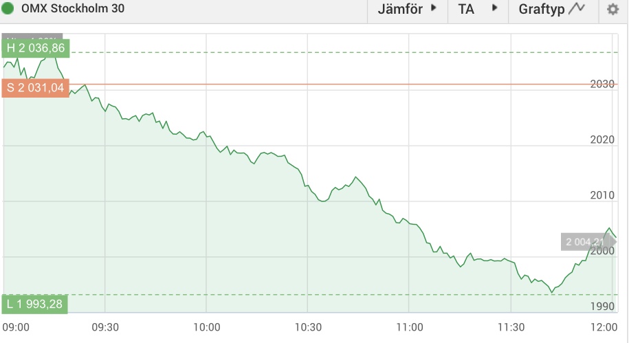 I fredags var OMX30 2037, igår skrev jag att vi skall först ned på 2000 punkter. Nu är vi där på denna kritiska stödnivå. Får köparna övertaget vänder det nu. Tyvärr tror jag att det finns risk för att vi skall ned till 1950 innan vinsthemtagarna är nöjda. Det är naturligt att blir så när OMX tangerar rekordnivåer. Nu kan man passa på att gå in i aktier som man ansett för dyra tidigare. Ser faktisktiskt i detta nu en liten tendens till att vi vänder uppåt från 2000. Vi håller tummarna för det.