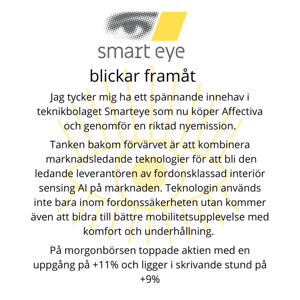 Smarteye blickar framåt 26 maj, 2021Per G Ohlin Dela detta: Dela på X (Öppnas i ett nytt fönster) X Dela på Facebook (Öppnas i ett nytt fönster) Facebook Gilla detta:Gilla Laddar in … Relaterade