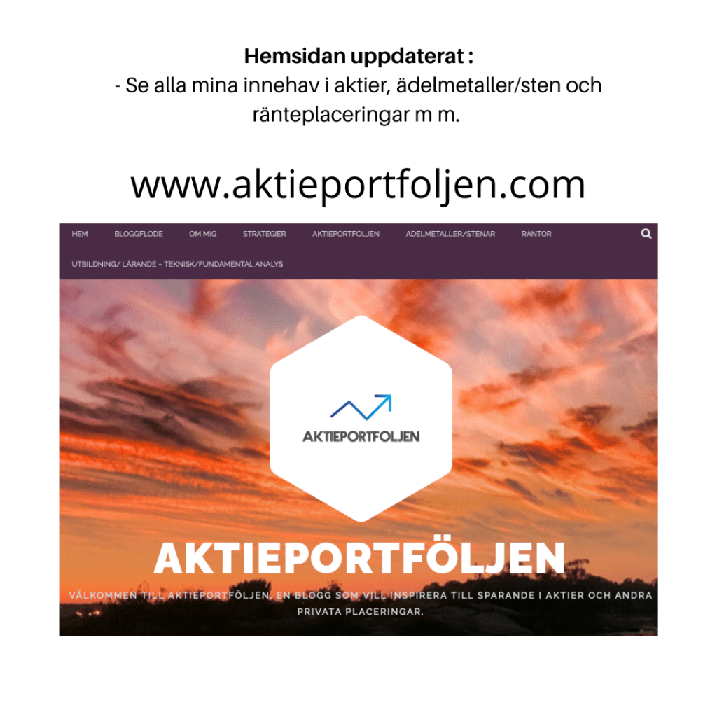 Aktieinnehav m m uppdaterat på hemsidan 16 augusti, 2021Per G Ohlin Hemsidan uppdaterad: Se mina innehav i aktier, ädelmetaller/sten och ränteplaceringar… www.aktieportfoljen.com Dela detta: Dela på X (Öppnas i ett nytt fönster) X Dela på Facebook (Öppnas i ett nytt fönster) Facebook Gilla detta:Gilla Laddar in … Relaterade