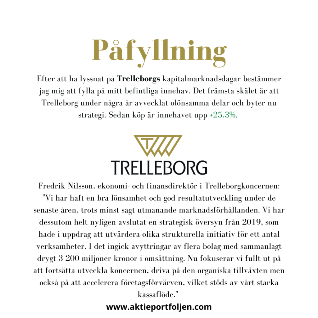 Efter att ha lyssnat på Trelleborgs kapitalmarknadsdagar bestämmer jag mig att fylla på mitt befintliga innehav. Det främsta skälet är att Trelleborg under några år avvecklat olönsamma delar och byter nu strategi. Sedan köp är innehavet upp +25,3%. Fredrik Nilsson, ekonomi- och finansdirektör i Trelleborgkoncernen: ”Vi har haft en bra lönsamhet och god resultatutveckling under de senaste åren, trots minst sagt utmanande marknadsförhållanden. Vi har dessutom helt nyligen avslutat en strategisk översyn från 2019, som hade i uppdrag att utvärdera olika strukturella initiativ för ett antal verksamheter. I det ingick avyttringar av flera bolag med sammanlagt drygt 3 200 miljoner kronor i omsättning. Nu fokuserar vi fullt ut på att fortsätta utveckla koncernen, driva på den organiska tillväxten men också på att accelerera företagsförvärven, vilket stöds av vårt starka kassaflöde.”