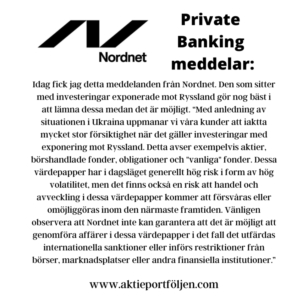 Idag fick jag detta meddelanden från Nordnet. Den som sitter med investeringar exponerade mot Ryssland gör nog bäst i att lämna dessa medan det är möjligt. “Med anledning av situationen i Ukraina uppmanar vi våra kunder att iaktta mycket stor försiktighet när det gäller investeringar med exponering mot Ryssland. Detta avser exempelvis aktier, börshandlade fonder, obligationer och ”vanliga” fonder. Dessa värdepapper har i dagsläget generellt hög risk i form av hög volatilitet, men det finns också en risk att handel och avveckling i dessa värdepapper kommer att försvåras eller omöjliggöras inom den närmaste framtiden. Vänligen observera att Nordnet inte kan garantera att det är möjligt att genomföra affärer i dessa värdepapper i det fall det utfärdas internationella sanktioner eller införs restriktioner från börser, marknadsplatser eller andra finansiella institutioner.”