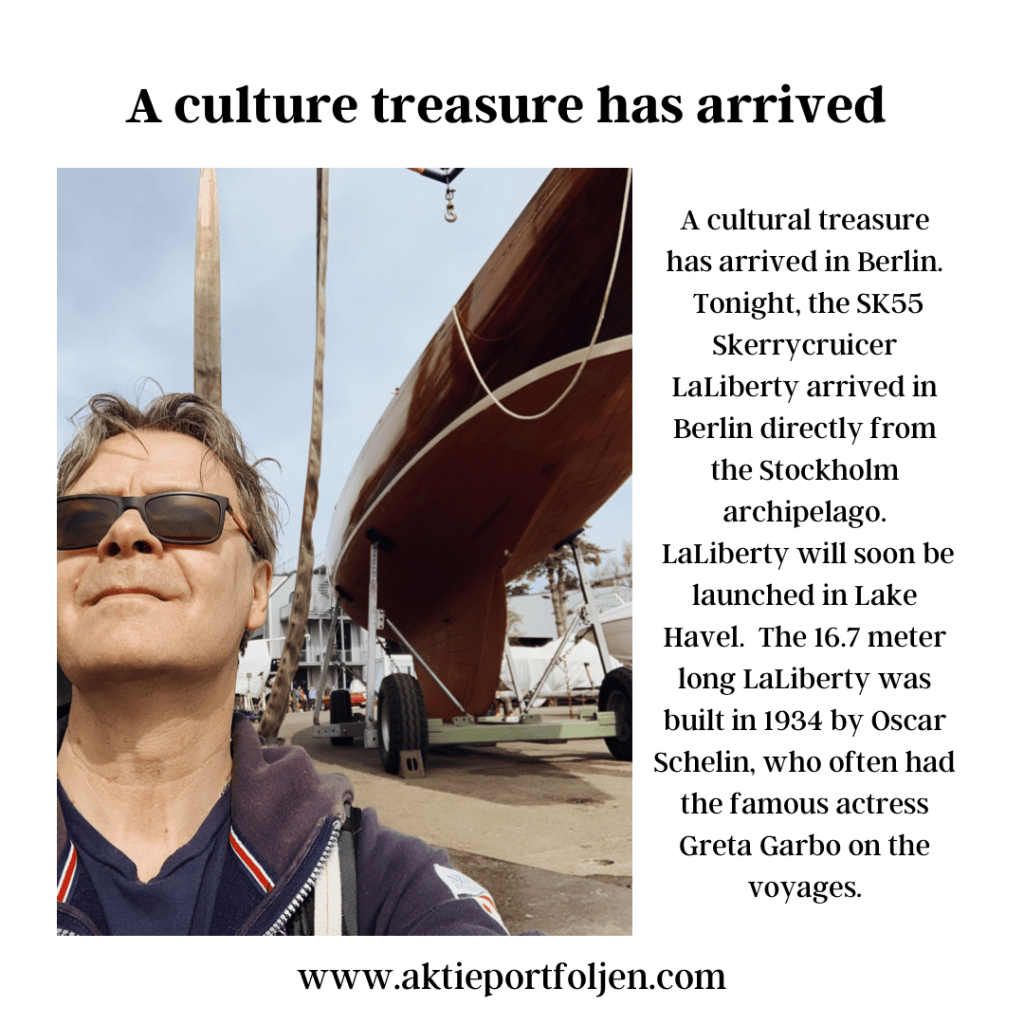 A cultural treasure has arrived in Berlin. Tonight, the SK55 Skerrycruicer LaLiberty arrived in Berlin directly from the Stockholm archipelago. LaLiberty will soon be launched in Lake Havel. The 16.7 meter long LaLiberty was built in 1934 by Oscar Schelin, who often had the famous actress Greta Garbo on the voyages.