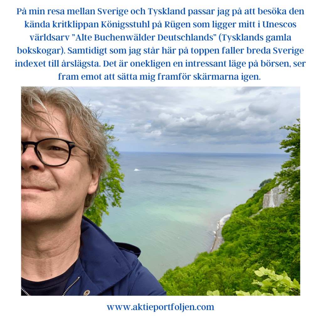 På min resa mellan Sverige och Tyskland passar jag på att besöka den kända kritklippan Königsstuhl på Rügen som ligger mitt i Unescos världsarv ”Alte Buchenwälder Deutschlands” (Tysklands gamla bokskogar). Samtidigt som jag står här på toppen faller breda Sverige indexet till årslägsta. Det är onekligen en intressant läge på börsen, ser fram emot att sätta mig framför skärmarna igen.
