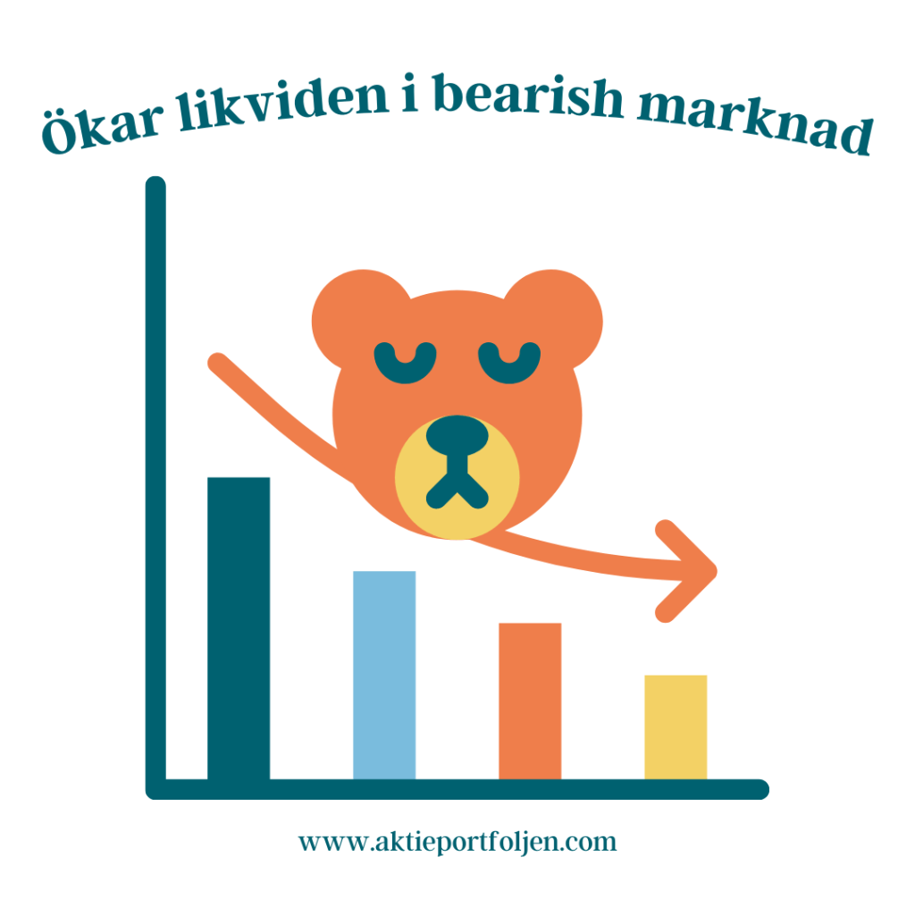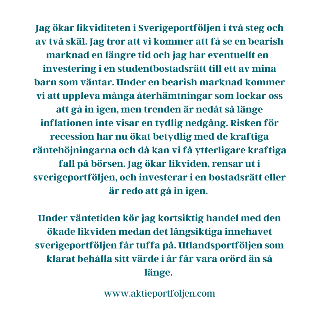 Jag ökar likviditeten i Sverigeportföljen i två steg och av två skäl. Jag tror att vi kommer att få se en bearish marknad en längre tid och jag har eventuellt en investering i en studentbostadsrätt till ett av mina barn som väntar. Under en bearish marknad kommer vi att uppleva många återhämtningar som lockar oss att gå in igen, men trenden är nedåt så länge inflationen inte visar en tydlig nedgång. Risken för recession har nu ökat betydlig med de kraftiga räntehöjningarna och då kan vi få ytterligare kraftiga fall på börsen. Jag ökar likviden, rensar ut i sverigeportföljen, och investerar i en bostadsrätt eller är redo att gå in igen. Under väntetiden kör jag kortsiktig handel med den ökade likviden medan det långsiktiga innehavet sverigeportföljen får tuffa på. Utlandsportföljen som klarat behålla sitt värde i år får vara orörd än så länge.