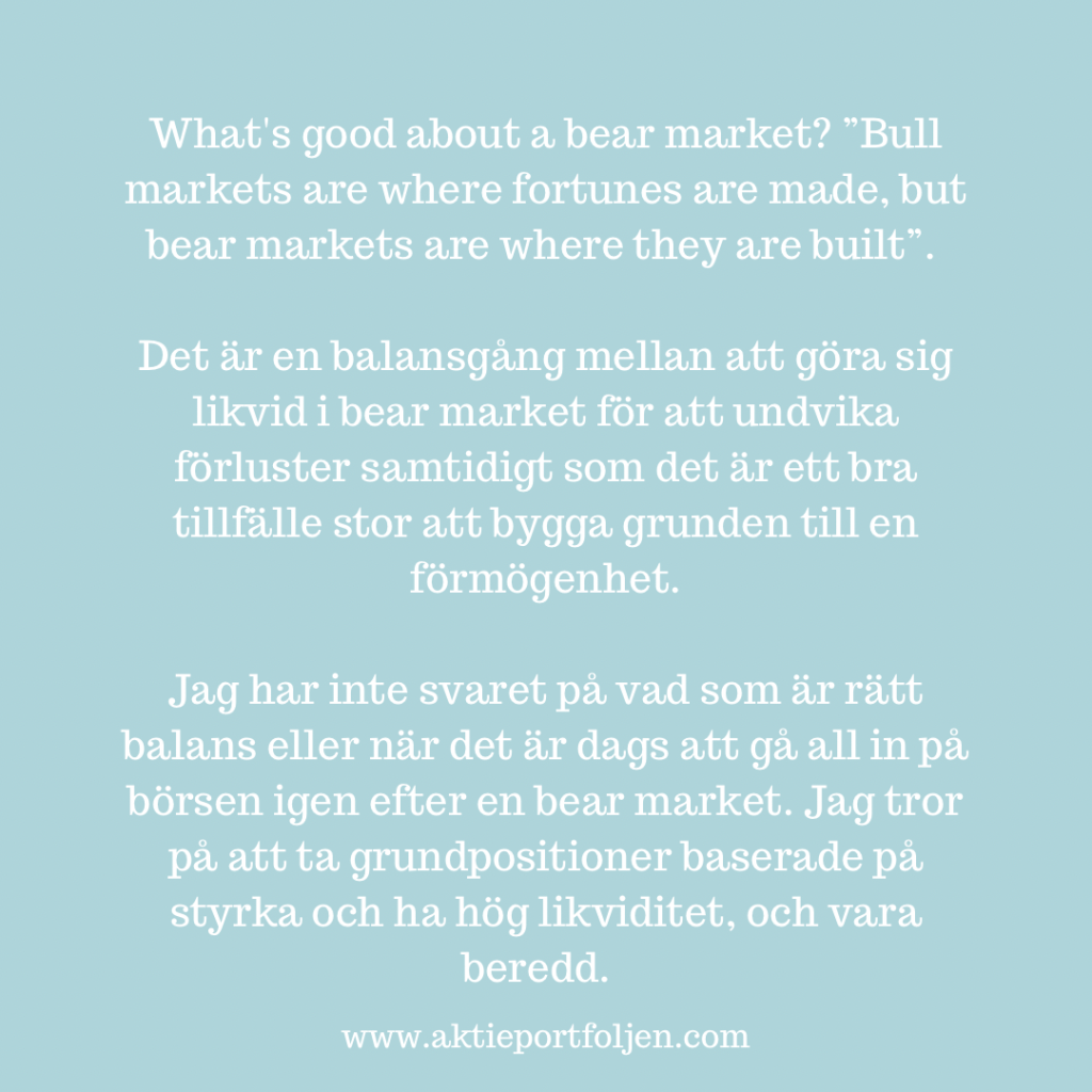 What’s good about a bear market? ”Bull markets are where fortunes are made, but bear markets are where they are built”. Det är en balansgång mellan att göra sig likvid i bear market för att undvika förluster samtidigt som det är ett bra tillfälle stor att bygga grunden till en förmögenhet. Jag har inte svaret på vad som är rätt balans eller när det är dags att gå all in på börsen igen efter en bear market. Jag tror på att ta grundpositioner baserade på styrka och ha hög likviditet, och vara beredd.