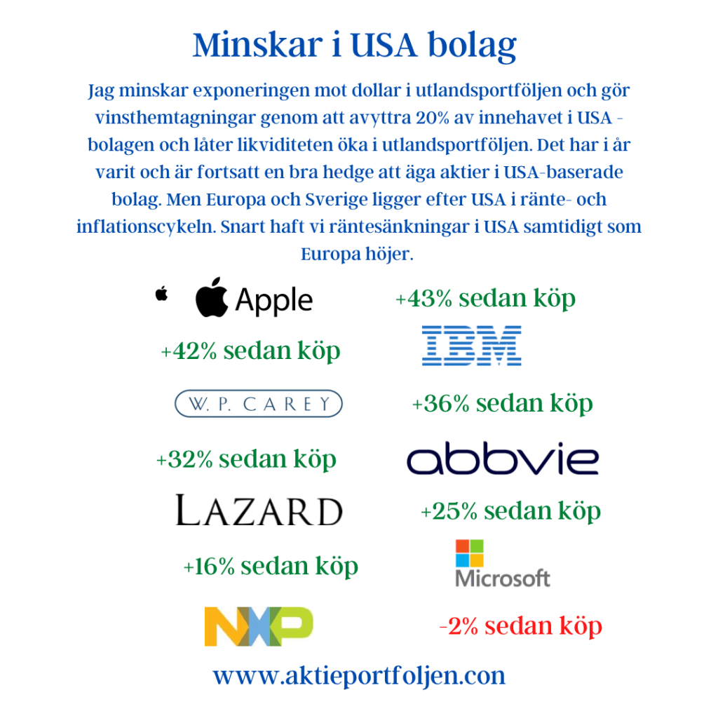 Jag minskar exponeringen mot dollar i utlandsportföljen och gör vinsthemtagningar genom att avyttra 20% av innehavet i USA -bolagen och låter likviditeten öka i utlandsportföljen. Det har i år varit och är fortsatt en bra hedge att äga aktier i USA-baserade bolag. Men Europa och Sverige ligger efter USA i ränte- och inflationscykeln. Snart haft vi räntesänkningar i USA samtidigt som Europa höjer.