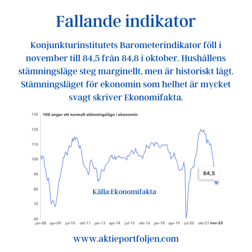 Konjunkturinstitutets Barometerindikator föll i november till 84,5 från 84,8 i oktober. Hushållens stämningsläge steg marginellt, men är historiskt lågt. Stämningsläget för ekonomin som helhet är mycket svagt skriver Ekonomifakta. Att vi är på väg in i en lågkonjuktur, dvs vi är inte där ännu, visar enligt min mening Konjunkturinstitutets Barometerindikator för olika branscher. Tillverkningsindustrin och bygg och anläggning ligger fortfarande över 100 i november. Vi kan räkna med en skvalpig börsresa framöver, men jag tror inte vi går under botten från oktober på börsindexen.