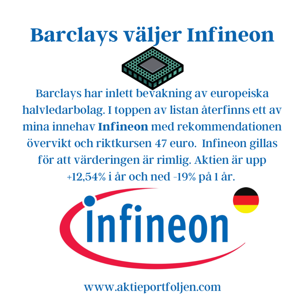 Barclays har inlett bevakning av europeiska halvledarbolag. I toppen av listan återfinns ett av mina innehav Infineon med rekommendationen övervikt och riktkursen 47 euro. Infineon gillas för att värderingen är rimlig. Aktien är upp +12,54% i år och ned -19% på 1 år.
