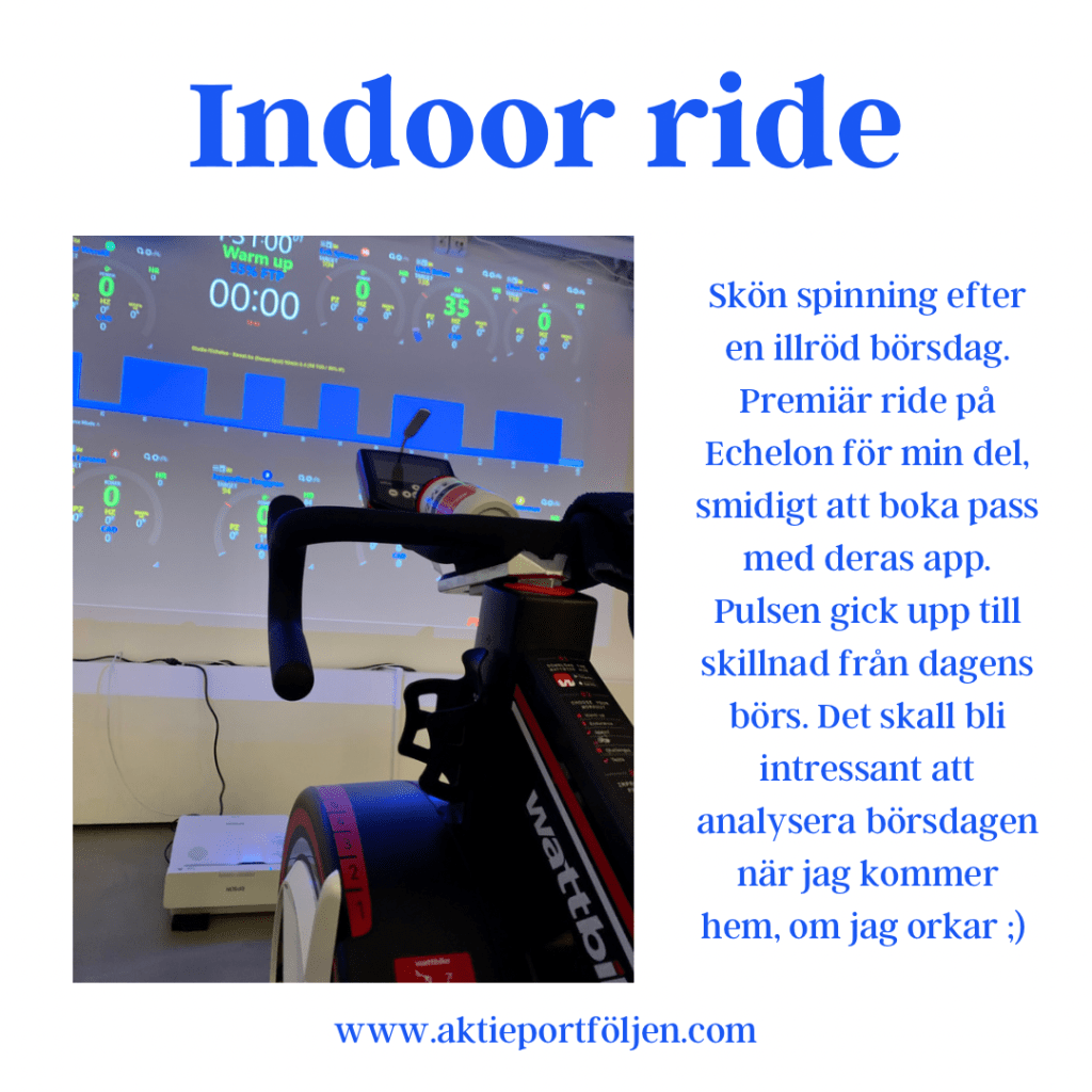 Skön spinning efter en illröd börsdag. Premiär ride på Echelon för min del, smidigt att boka pass med deras app. Pulsen gick upp till skillnad från dagens börs. Det skall bli intressant att analysera börsdagen när jag kommer hem, om jag orkar 😉
