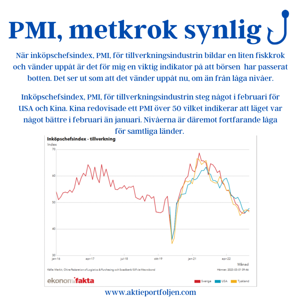 När inköpschefsindex, PMI, för tillverkningsindustrin bildar en liten fiskkrok och vänder uppåt är det för mig en viktig indikator på att börsen har passerat botten. Det ser ut som att det vänder uppåt nu, om än från låga nivåer. Inköpschefsindex, PMI, för tillverkningsindustrin steg något i februari för USA och Kina. Kina redovisade ett PMI över 50 vilket indikerar att läget var något bättre i februari än januari. Nivåerna är däremot fortfarande låga för samtliga länder. I Sverige var PMI-total oförändrat i februari på 47,0 och det är sjunde månaden i rad som indexet är utanför tillväxtzonen. Nedgången i industrin fortsätter men i en avtagande takt. Fler tecken tyder på att industrikonjunkturen håller på att bottna samtidigt som produktionsplanerna är på väg upp, säger Jörgen Kennemar, ansvarig för analysen av inköpschefsindex på Swedbank.