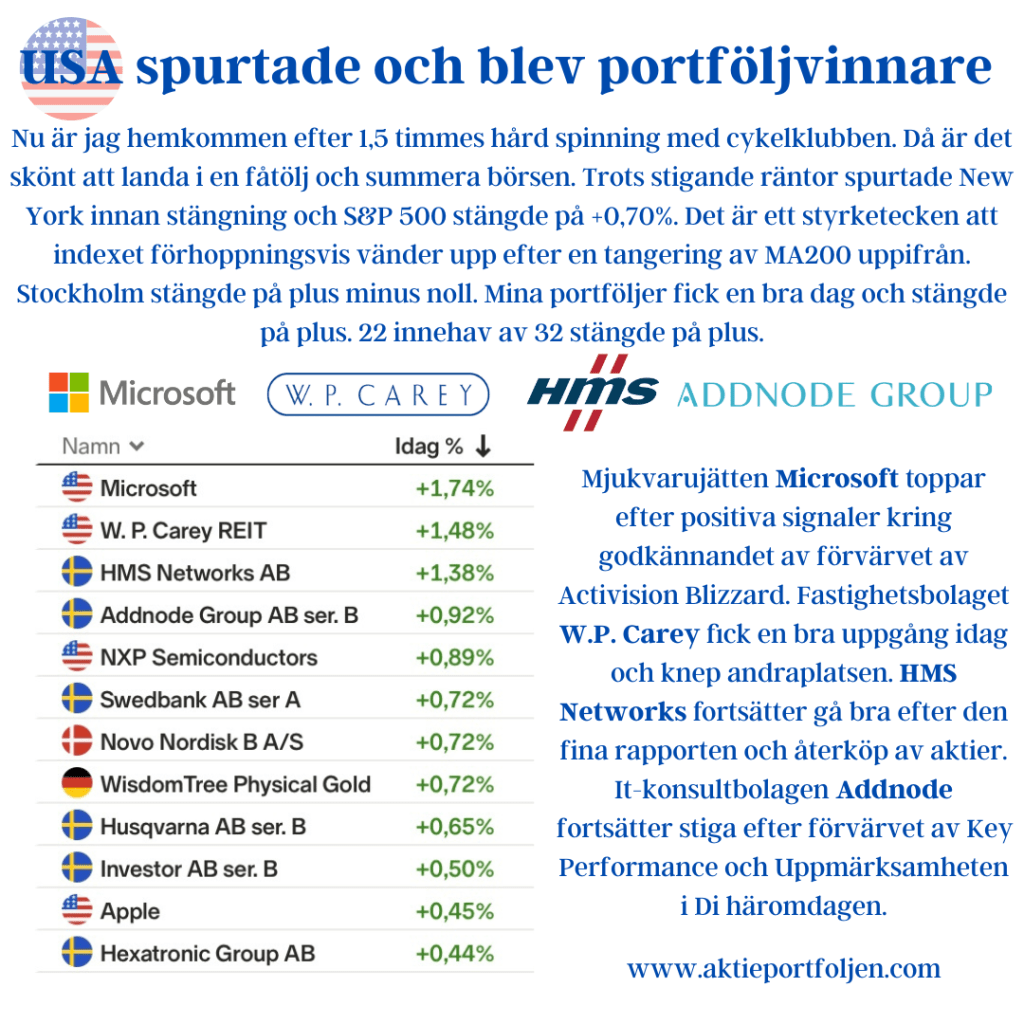 Nu är jag hemkommen efter 1,5 timmes hård spinning med cykelklubben. Då är det skönt att landa i en fåtölj och summera börsen. Trots stigande räntor spurtade New York innan stängning och S&P 500 stängde på +0,70%. Det är ett styrketecken att indexet förhoppningsvis vänder upp efter en tangering av MA200 uppifrån. Stockholm stängde på plus minus noll. Mina portföljer fick en bra dag och stängde på plus. 22 innehav av 32 stängde på plus. Mjukvarujätten Microsoft toppar efter positiva signaler kring godkännandet av förvärvet av Activision Blizzard. Fastighetsbolaget W.P. Carey fick en bra uppgång idag och knep andraplatsen. HMS Networks fortsätter gå bra efter den fina rapporten och återköp av aktier. It-konsultbolagen Addnode fortsätter stiga efter förvärvet av Key Performance och Uppmärksamheten i Di häromdagen.