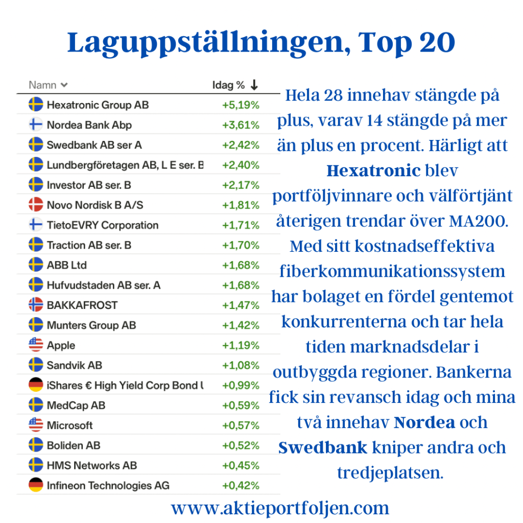 Efter bankoron blev det revansch för börserna och särskilt för banksektorn. Glädjande nog studsar S&P500 över MA200 igen och VIX-indexet gick ned mot 20, dvs en lugnare börs. Det återstår att se om detta bekräftas imorgon när FED sätter räntan. Samtliga bolag i laguppställningen trendar över MA200 igen med undantag för Svolder. Jag fortsätter att öka stegvis i aktiedelen med likvid från sidlinjen, ändå blev likvidandelen oförändrad eftersom jag gjorde vinsthemtagning i guld etf:en. Guldet är på överköpta nivåer på 74 (RSI 14) och i övre kanten av Bollinger bandet så det var säljläge. Hela 28 innehav stängde på plus, varav 14 stängde på mer än plus en procent. Härligt att Hexatronic blev portföljvinnare och välförtjänt återigen trendar över MA200. Med sitt kostnadseffektiva fiberkommunikationssystem har bolaget en fördel gentemot konkurrenterna och tar hela tiden marknadsdelar i outbyggda regioner. Bankerna fick sin revansch idag och mina två innehav Nordea och Swedbank kniper andra och tredjeplatsen.