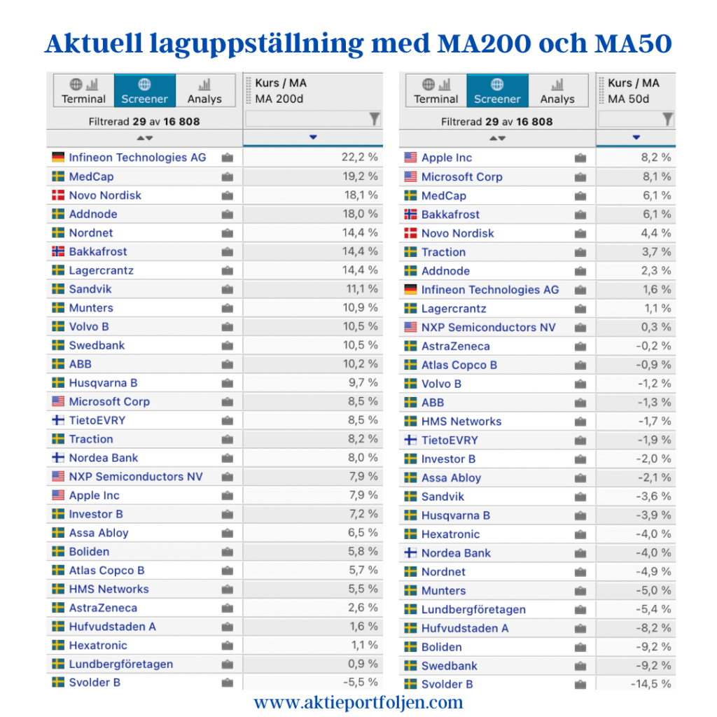 Jag har två grundstrategier, dels fyller jag på i innehav som trendar bäst på MA50 och som redan klarat grundkravet att trenda över MA200 och klarar min fundamentala check. Är jag fullinvesterad går jag vidare ned i MA50-listan och jag har inget krav på att ett innehav ska trenda över MA50. Jag fyller på från likviden på sidlinjen eller avyttring av de innehav som faller under MA200. I en ren bearmarket där allt faller halverar jag innehaven och avvaktar. Den andra strategin är att jag bygger upp en grund i investmentbolag där jag endast har fundamentala krav. Det innebär bl a att investmentbolagen kan få vara kvar i laguppställningen även om de trendar under MA200.