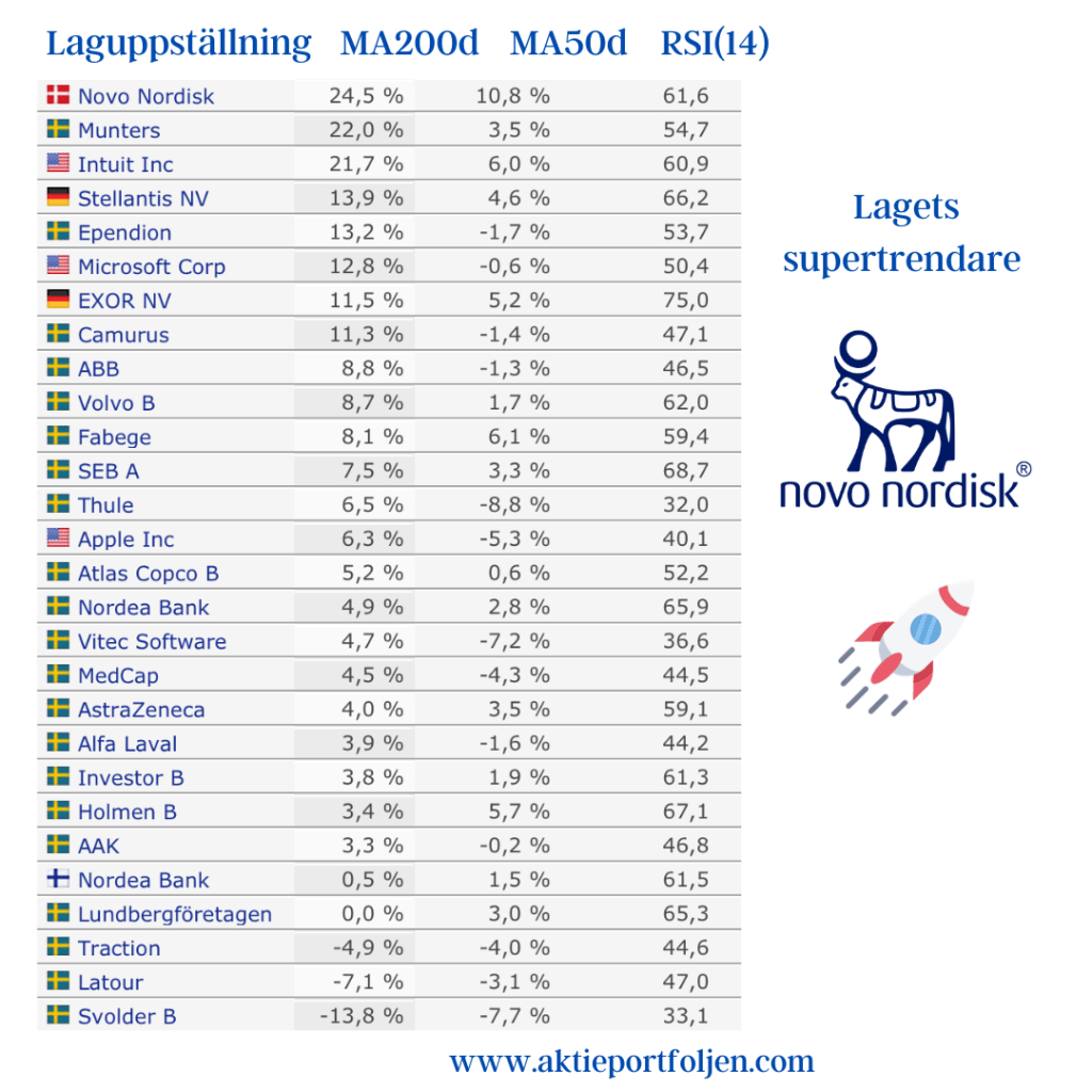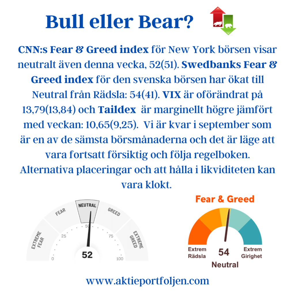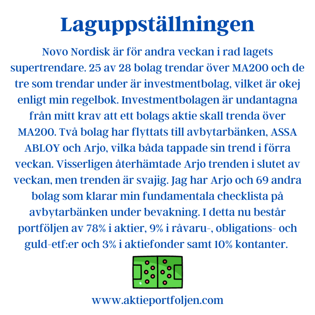 På torsdag blir det en europeisk supertorsdag, då lämnas räntebesked i Sverige, Storbritannien, Norge och Schweiz. Den svenska Riksbanken förväntas höja styrräntan med 0,25 punkter till 4%, inte bara för att dämpa inflationens, utan även för försvara kronkursen. På tisdag redovisas inflationsutfall för Eurozonen där marknaden väntar sig utfall på 5,3% i årstakt. På onsdag kväll förväntas FED lämna räntan oförändrad i intervallet 5-5,25%. Troligen med en hökaktig kommunikation om att ytterligare en höjning i år kan bli aktuell, men som inte kommer att genomföras. Den första sänkningen förväntas i maj, vilket är något senare än tidigare prognoser. CNN:s Fear & Greed index för New York börsen visar neutralt även denna vecka, 52(51). Swedbanks Fear & Greed index för den svenska börsen har ökat till Neutral från Rädsla: 54(41). VIX är oförändrat på 13,79(13,84) och Taildex är marginellt högre jämfört med veckan: 10,65(9,25). Vi är kvar i september som är en av de sämsta börsmånaderna och det är läge att vara fortsatt försiktig och följa regelboken. Alternativa placeringar och att hålla i likviditeten kan vara klokt. Båda Stockholmsindexen trendar fortfarande under MA200 och MA50. Oslobörsen har gått starkt den senaste tiden och tagit över som näst bästa index efter Nasdaq 100. I övrigt är trenden fortsatt svag i övriga nordiska index. Novo Nordisk är för andra veckan i rad lagets supertrendare. 25 av 28 bolag trendar över MA200 och de tre som trendar under är investmentbolag, vilket är okej enligt min regelbok. Investmentbolagen är undantagna från mitt krav att ett bolags aktie skall trenda över MA200. Två bolag har flyttats till avbytarbänken, ASSA ABLOY och Arjo, vilka båda tappade sin trend i förra veckan. Visserligen återhämtade Arjo trenden i slutet av veckan, men trenden är svajig. Jag har Arjo och 69 andra bolag som klarar min fundamentala checklista på avbytarbänken under bevakning. I detta nu består portföljen av 78% i aktier, 9% i råvaru-, obligations- och guld-etf:er och 3% i aktiefonder samt 10% kontanter.