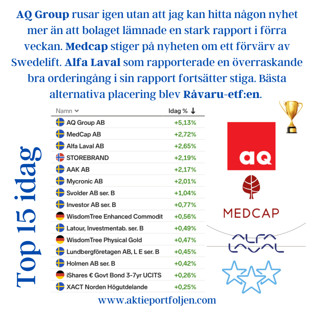 Min Sverigeportfölj hade en bra dag och stängde uppåt medan Stockholmsindexen stängde på rött. Min utlandsportfölj ligger något minus då Wall Street surnat till ikväll. Den amerikanska 10-åringen var uppe igen på 4,99% men har i eftermiddag raskt fallit tillbaka, i detta nu till 4,89%. Wall Street är ändå på dåligt humör, men det finns kanske en oro inför morgondagens amerikanska inflationsutfall. Idag kom Swedbank med en stark rapport men det blev en repris på SEB:s reaktionsflopp på rapporten. Det blev inte så smärtsamt då min regelbok redan halverat innehavet i Swedbank. Idag tog jag en ny position i Storebrand, enligt TNInfo-strategin, som stängde på sin rapport igår på +6% och trendar över MA200. Jag har viktat ned i Intuit som nu trendar 8% under MA50. Imorgon rapporterar Medcap. AQ Group rusar igen utan att jag kan hitta någon nyhet mer än att bolaget lämnade en stark rapport i förra veckan. Medcap stiger på nyheten om ett förvärv av Swedelift. Alfa Laval som rapporterade en överraskande bra orderingång i sin rapport fortsätter stiga. Bästa alternativa placering blev Råvaru-etf:en.