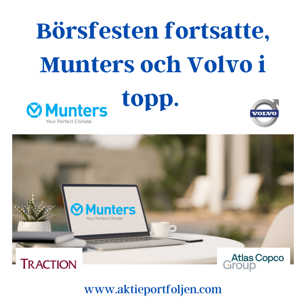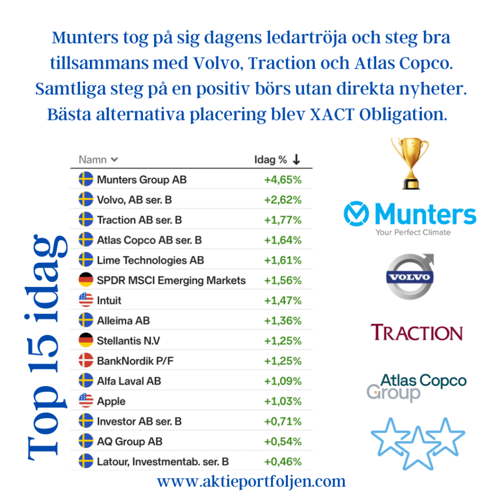 Munters tog på sig dagens ledartröja och steg bra tillsammans med Volvo, Traction och Atlas Copco. Samtliga steg på en positiv börs utan direkta nyheter. Bästa alternativa placering blev XACT Obligation.