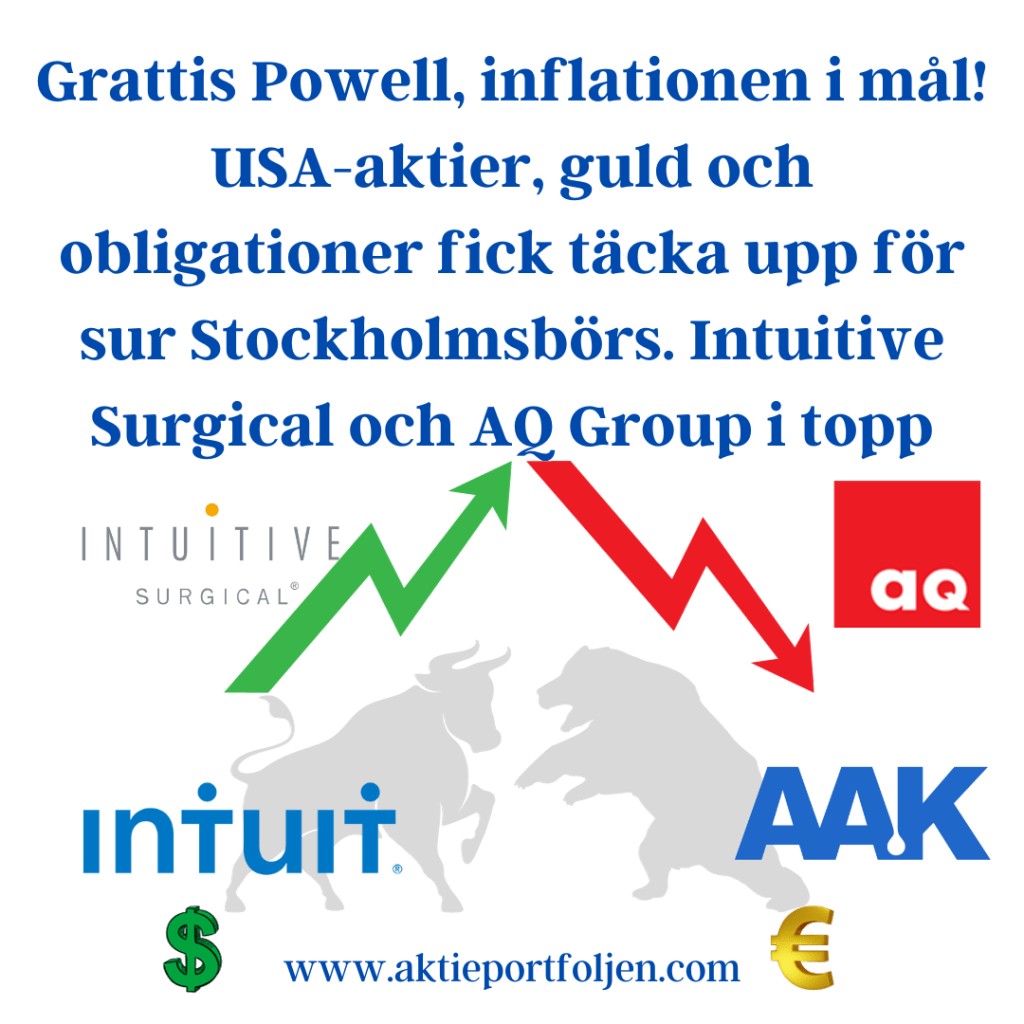 Wow, Fed är i mål med kärninflationen som kom in på 2% idag. Långräntorna faller och kronan stärks mot både dollarn och euron. Det är uppåt på Wall Street medan Stockholmsbörsen och Europa återhämtar sig och stängde på rött. I min laguppställning var det också de amerikanska aktieinnehaven och Allvädersportföljen med obligationer och guld som fick täcka upp . Ledartröjan gick till robotkirurgproducenten Intuitive Surgical. På Stockholmsbörsen gick verkstadsbolaget AQ Group mot strömmen och steg bra. Affärsprogramvaru-företaget Intuit ligger på tredje plats. I detta nu ligger en dollar på 10,10 och en euro 11,10 kr. Får vi se att någon faller under 10 respektive 11 kr?