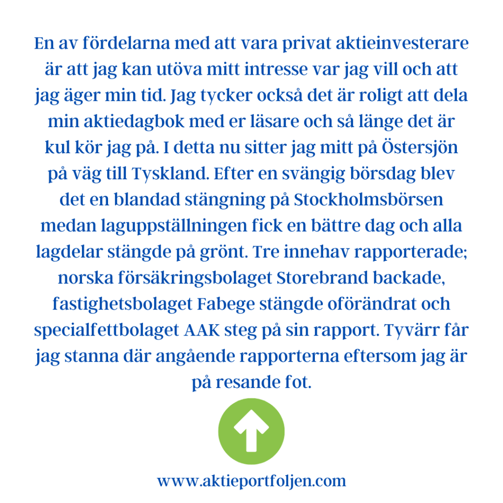 En av fördelarna med att vara privat aktieinvesterare är att jag kan utöva sitt intresse var jag vill och att jag äger min tid. Jag tycker också det är roligt att dela min aktiedagbok med er läsare och så länge det är kul kör jag på. I detta nu sitter jag mitt på Östersjön på väg till Tyskland. Efter en svängig börsdag blev det en blandad stängning på Stockholmsbörsen medan laguppställningen fick en bättre dag och alla lagdelar stängde på grönt. Tre innehav rapporterade; norska försäkringsbolaget Storebrand backade, fastighetsbolaget Fabege stängde oförändrat och specialfettbolaget AAK steg på sin rapport. Tyvärr får det stanna där angående rapporterna eftersom jag är på resande fot.