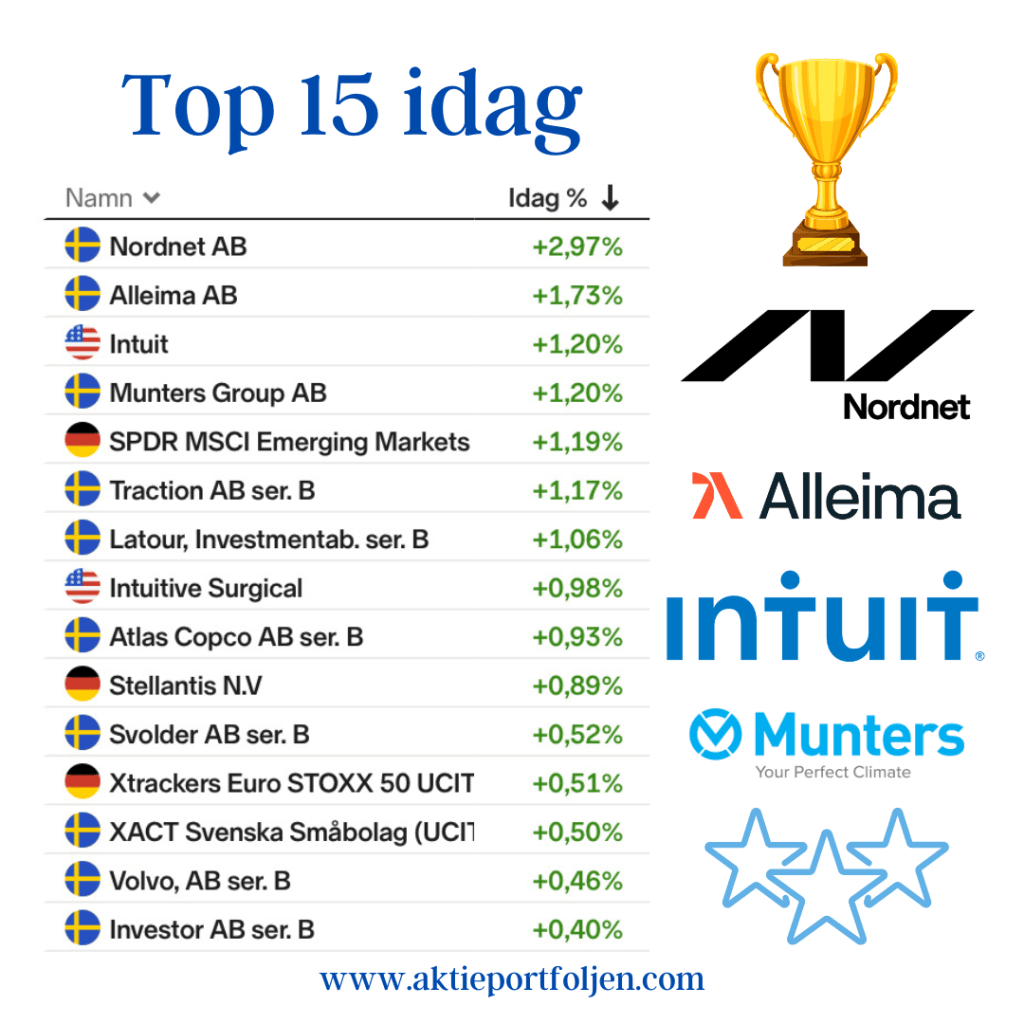 Breda uppgångar i Europa och Stockholms storbolagsindex stängde på rekordnivå. Även på Wall Street ser det grönt ut i detta nu. Den svenska kronan stärks med 1% mot dollarn och 0,52% mot Euron, vilket pressar utlandsinnehaven något. Bäst idag stängde nätmäklaren Nordnet som steg +3,0%. Igår kom siffror visade att nettosparandet i februari ökade med 104% jämfört med samma period förra året och antalet nya kunder uppgick till 19400. Tvåa kom verkstadsbolaget Alleima som nyligen fick fortsatt köp av Aktiespararna. Affärssystembolaget Intuit och klimatkontrollbolaget Muntersgick också bra utan direkta nyheter. Jag kommer att åka alpint mellan torsdag och söndag men det kommer säkert att finnas tid för hålla koll på börsen och skriva börsdagbok på kvällarna.