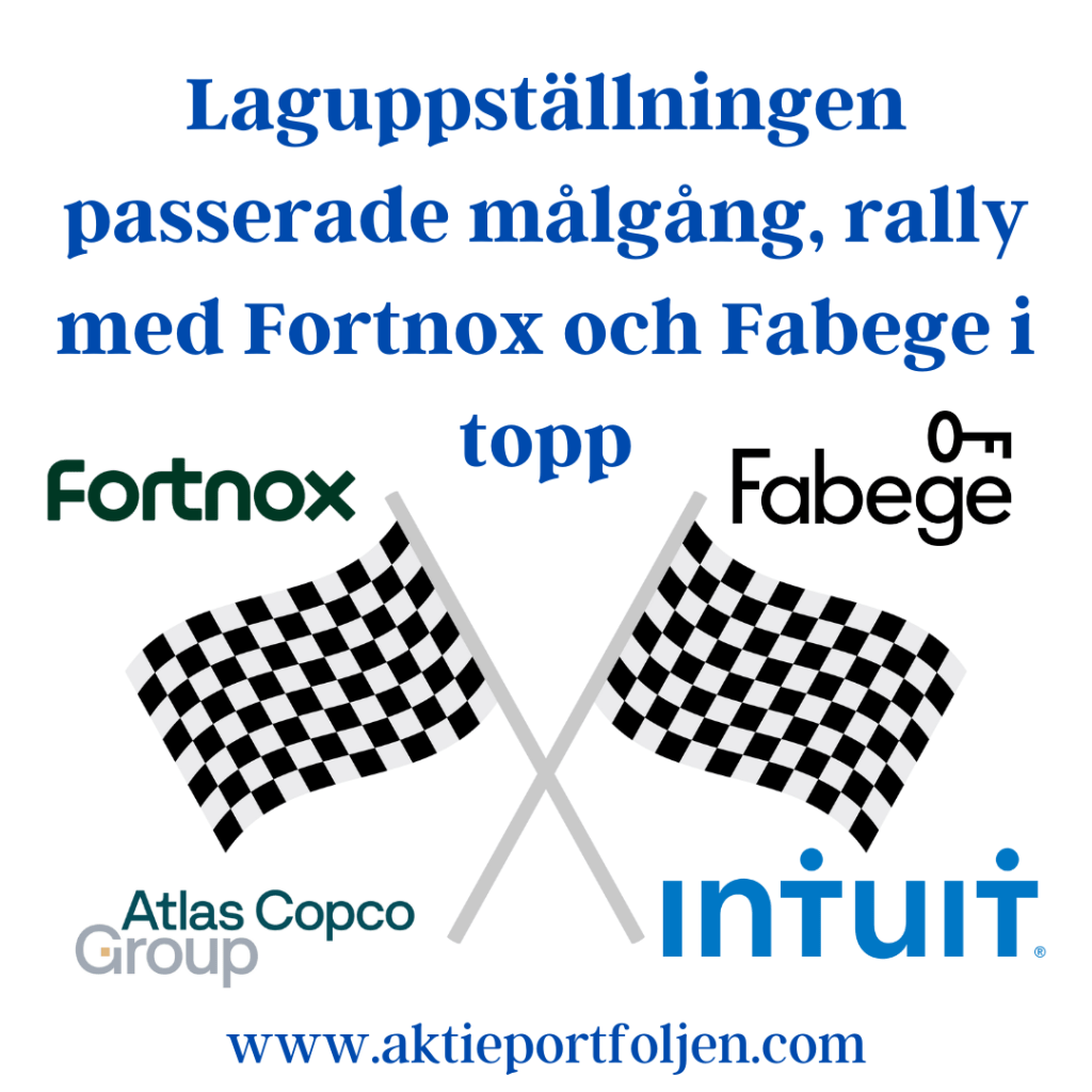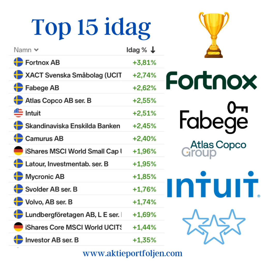 Under de här drygt fyra åren har investeringsarbetet varit ett sätt att leva och jag älskar fortsatt processen och då kommer resultaten av sig själv. Som bonus äger jag min tid och är geografiskt obunden. 36 av 40 innehav (inklusive alternativa placeringar) stängde grönt idag, varav 19 innehav steg med mer än +1,0 och 7 innehav steg med +2,0 eller mer. Dagens ledartröja gick till affärssystembolaget Fortnox som steg utan direkta nyheter. På andra plats kom fastighetsbolaget Fabege och troligen kommer fastighetsbolag att stärkas än mer när vi närmar oss räntesänkningarna. På tredje plats kom Atlas Copco som är inne i en stark trend. Fortnox amerikanska kollega affärsprogramföretaget Intuitkvalificerade sig också till vinnarkvartetten.