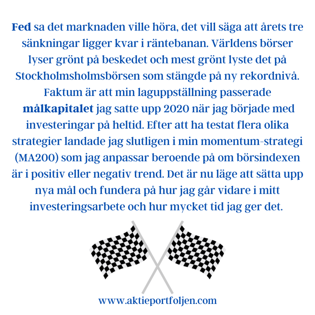 Fed sa det marknaden ville höra, det vill säga att årets tre sänkningar ligger kvar i räntebanan. Världens börser lyser grönt på beskedet och mest grönt lyste det på Stockholmsholmsbörsen som stängde på ny rekordnivå. Faktum är att min laguppställning passerade målkapitalet jag satte upp 2020 när jag började med investeringar på heltid. Efter att ha testat flera olika strategier landade jag slutligen i min momentum-strategi (MA200) som jag anpassar beroende på om börsindexen är i positiv eller negativ trend. Det är nu läge att sätta upp nya mål och fundera på hur jag går vidare i mitt investeringsarbete och hur mycket tid jag ger det.