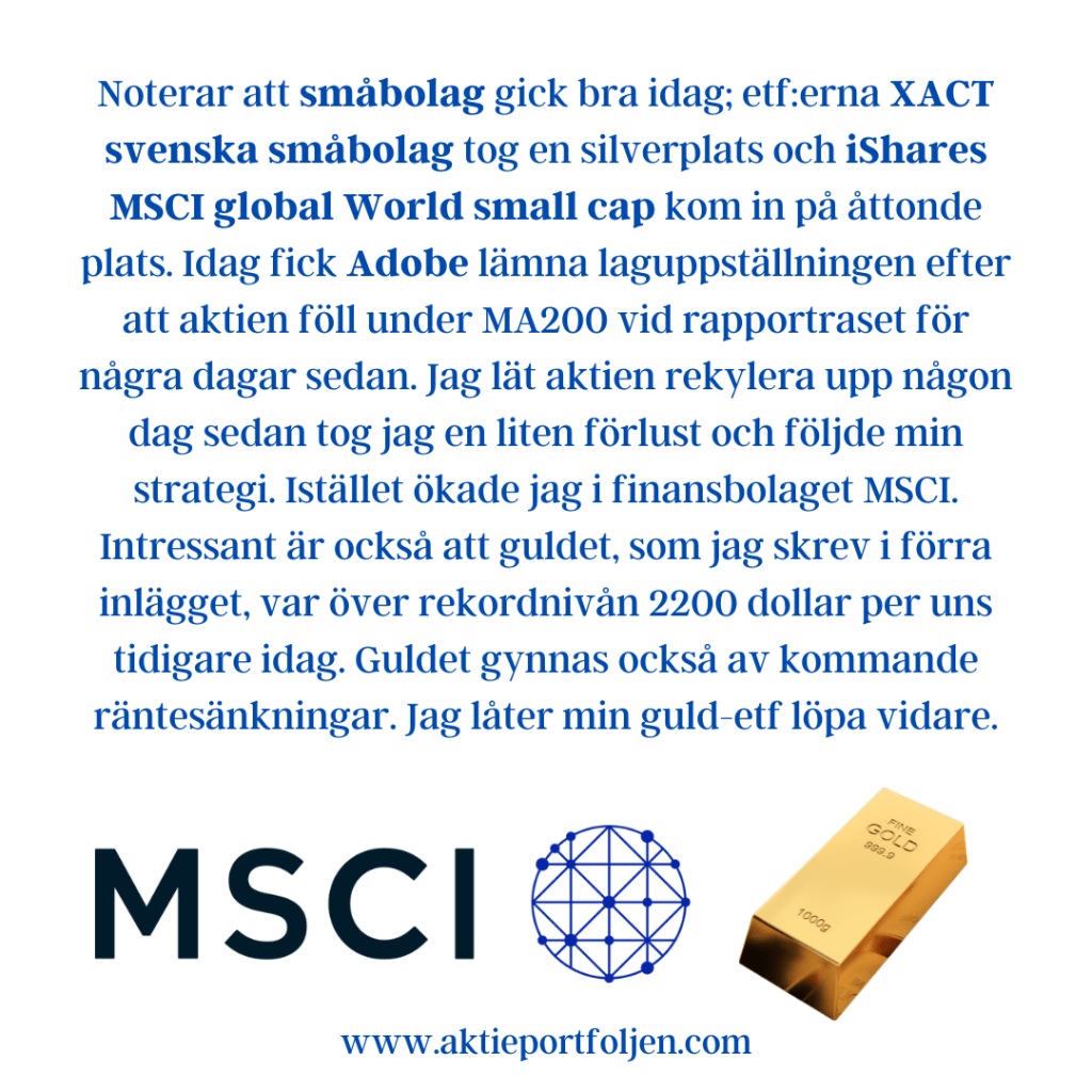 Noterar att småbolag gick bra idag; etf:erna XACT svenska småbolag tog en silverplats och iShares MSCI global World small cap kom in på åttonde plats. Idag fick Adobe lämna laguppställningen efter att aktien föll under MA200 vid rapportraset för några dagar sedan. Jag lät aktien rekylera upp någon dag sedan tog jag en liten förlust och följde min strategi. Istället ökade jag i finansbolaget MSCI. Intressant är också att guldet, som jag skrev i förra inlägget, var över rekordnivån 2200 dollar per uns tidigare idag. Guldet gynnas också av kommande räntesänkningar. Jag låter min guld-etf löpa vidare.