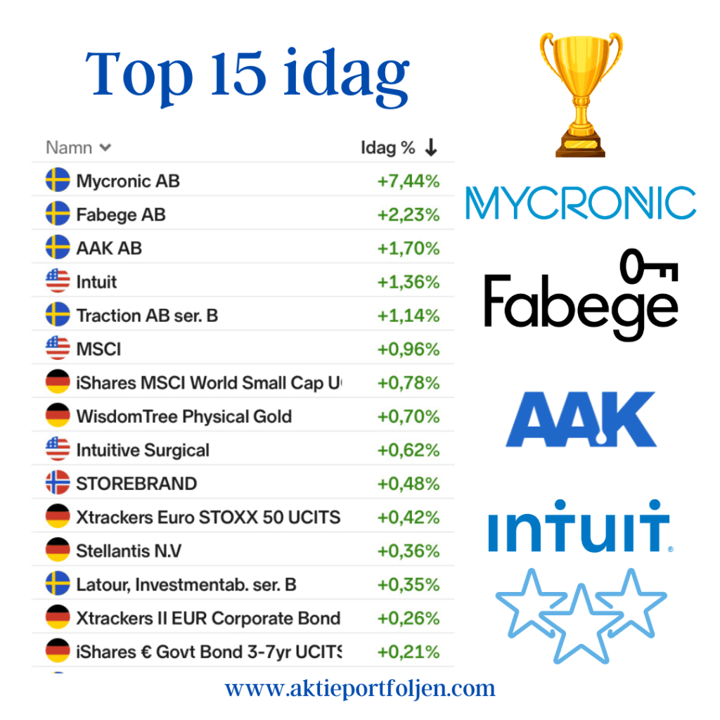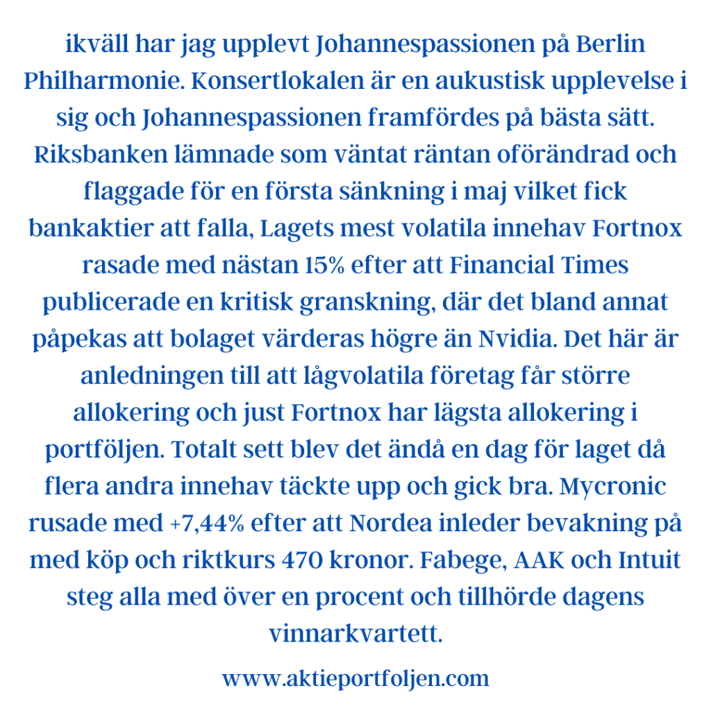 ikväll har jag upplevt Johannespassionen på Berlin Philharmonie. Konsertlokalen är en aukustisk upplevelse i sig och Johannespassionen framfördes på bästa sätt. Riksbanken lämnade som väntat räntan oförändrad och flaggade för en första sänkning i maj vilket fick bankaktier att falla, Lagets mest volatila innehav Fortnox rasade med nästan 15% efter att Financial Times publicerade en kritisk granskning, där det bland annat påpekas att bolaget värderas högre än Nvidia. Det här är anledningen till att lågvolatila företag får större allokering och just Fortnox har lägsta allokering i portföljen. Totalt sett blev det ändå en dag för laget då flera andra innehav täckte upp och gick bra. Mycronic rusade med +7,44% efter att Nordea inleder bevakning på med köp och riktkurs 470 kronor. Fabege, AAK och Intuit steg alla med över en procent och tillhörde dagens vinnarkvartett.