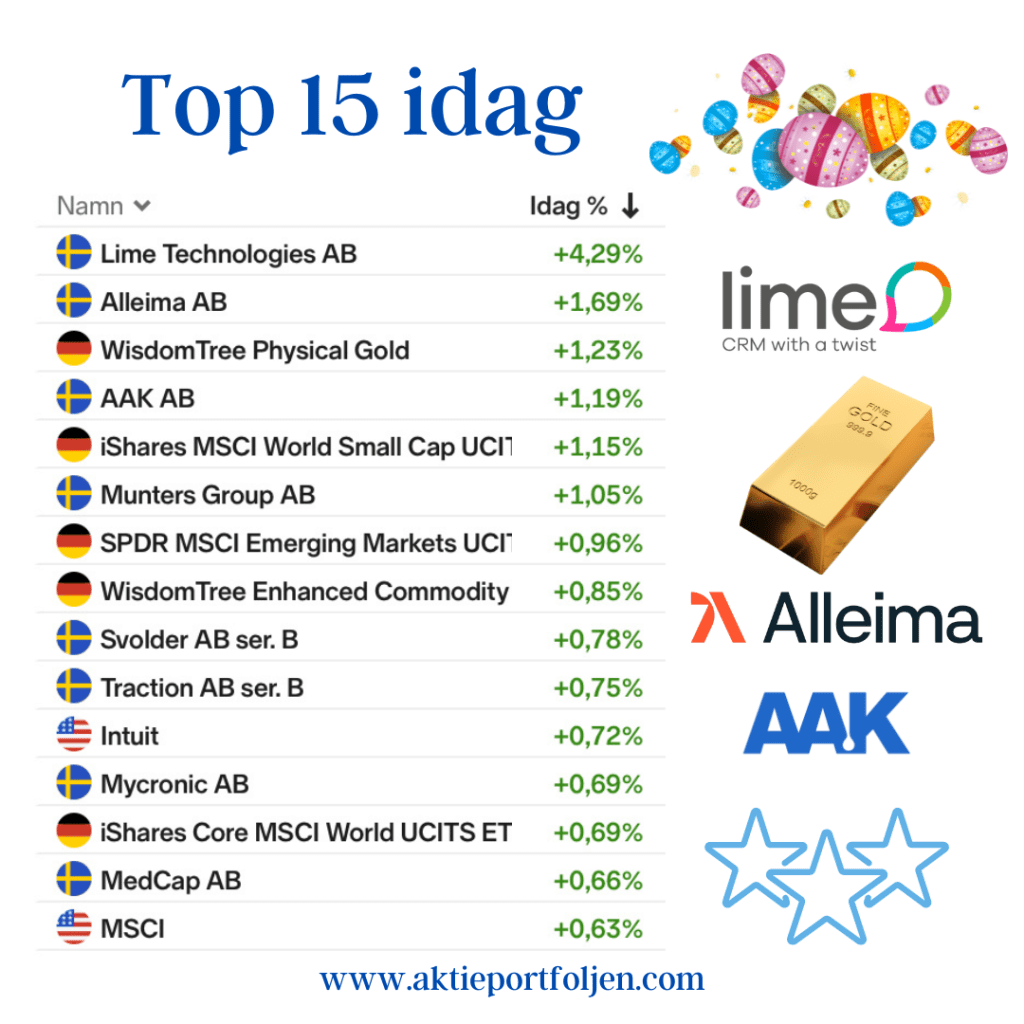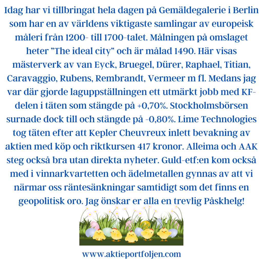 Idag har vi tillbringat hela dagen på Gemäldegalerie i Berlin som har en av världens viktigaste samlingar av europeisk måleri från 1200- till 1700-talet. Målningen på omslaget heter ”The ideal city” och är målad 1490. Här visas mästerverk av van Eyck, Bruegel, Dürer, Raphael, Titian, Caravaggio, Rubens, Rembrandt, Vermeer m fl. Medans jag var där gjorde laguppställningen ett utmärkt jobb med KF-delen i täten som stängde på +0,70%. Stockholmsbörsen surnade dock till och stängde på -0,80%. Lime Technologies tog täten efter att Kepler Cheuvreux inlett bevakning av aktien med köp och riktkursen 417 kronor. Alleima och AAK steg också bra utan direkta nyheter. Guld-etf:en kom också med i vinnarkvartetten och ädelmetallen gynnas av att vi närmar oss räntesänkningar samtidigt som det finns en geopolitisk oro. Jag önskar er alla en trevlig Påskhelg!