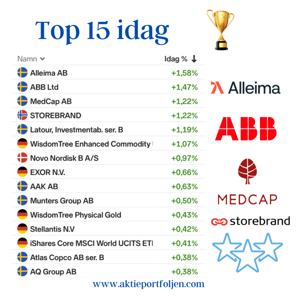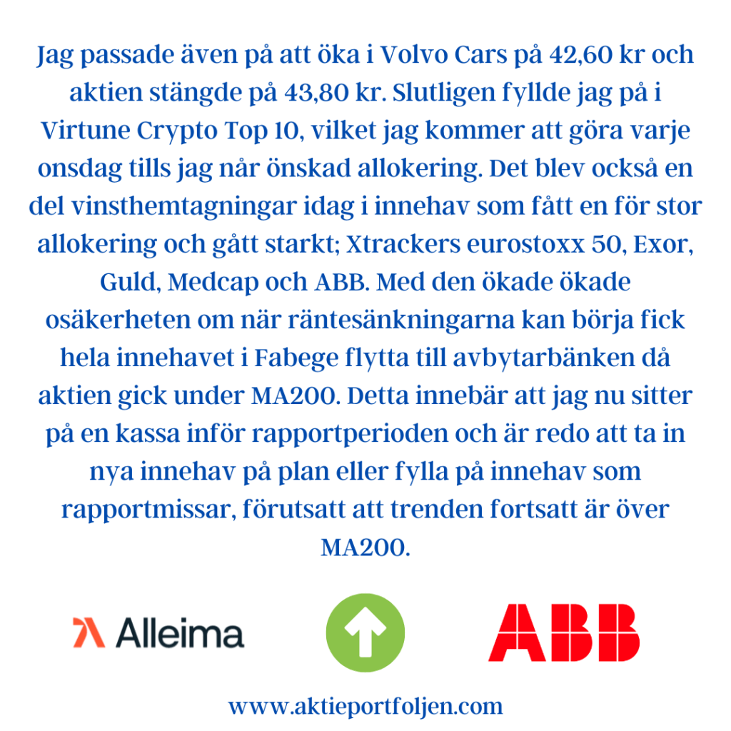 Jag passade även på att öka i Volvo Cars på 42,60 kr och aktien stängde på 43,80 kr. Slutligen fyllde jag på i Virtune Crypto Top 10, vilket jag kommer att göra varje onsdag tills jag når önskad allokering. Det blev också en del vinsthemtagningar idag i innehav som fått en för stor allokering och gått starkt; Xtrackers eurostoxx 50, Exor, Guld, Medcap och ABB. Med den ökade ökade osäkerheten om när räntesänkningarna kan börja fick hela innehavet i Fabege flytta till avbytarbänken då aktien gick under MA200. Detta innebär att jag nu sitter på en kassa inför rapportperioden och är redo att ta in nya innehav på plan eller fylla på innehav som rapportmissar, förutsatt att trenden fortsatt är över MA200.