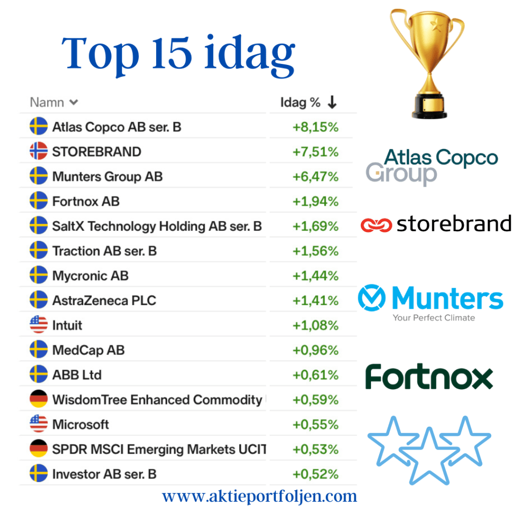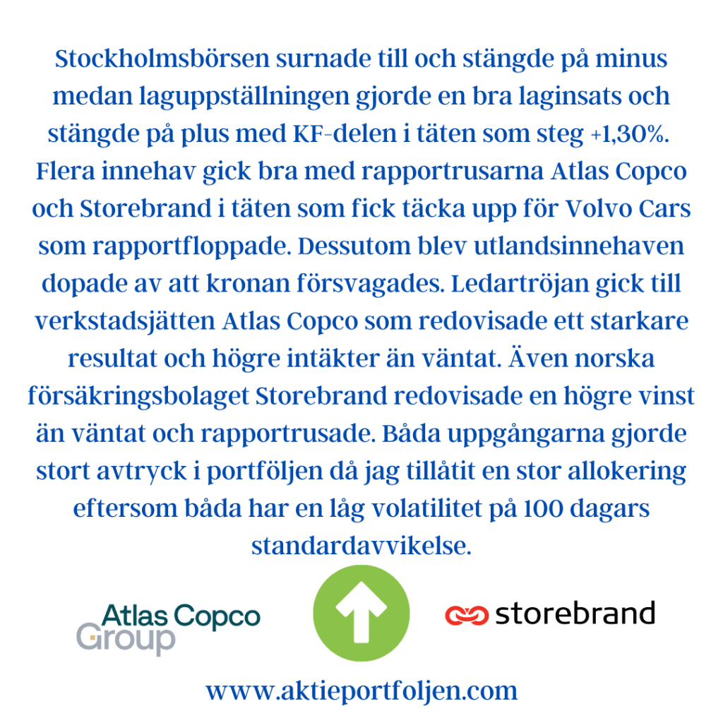 Stockholmsbörsen surnade till och stängde på minus medan laguppställningen gjorde en bra laginsats och stängde på plus med KF-delen i täten som steg +1,30%. Flera innehav gick bra med rapportrusarna Atlas Copco och Storebrand i täten som fick täcka upp för Volvo Cars som rapportfloppade. Dessutom blev utlandsinnehaven dopade av att kronan försvagades. Ledartröjan gick till verkstadsjätten Atlas Copco som redovisade ett starkare resultat och högre intäkter än väntat. Även norska försäkringsbolaget Storebrand redovisade en högre vinst än väntat och rapportrusade. Båda uppgångarna gjorde stort avtryck i portföljen då jag tillåtit en stor allokering eftersom båda har en låg volatilitet på 100 dagars standardavvikelse.
