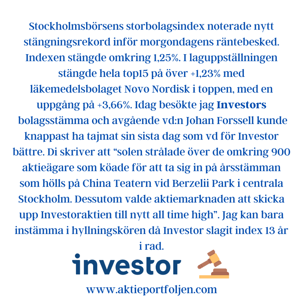 Stockholmsbörsens storbolagsindex noterade nytt stängningsrekord inför morgondagens räntebesked. Indexen stängde omkring 1,25%. I laguppställningen stängde hela top15 på över +1,23% med läkemedelsbolaget Novo Nordisk i toppen, med en uppgång på +3,66%. Idag besökte jag Investors bolagsstämma och avgående vd:n Johan Forssell kunde knappast ha tajmat sin sista dag som vd för Investor bättre. Di skriver att “solen strålade över de omkring 900 aktieägare som köade för att ta sig in på årsstämman som hölls på China Teatern vid Berzelii Park i centrala Stockholm. Dessutom valde aktiemarknaden att skicka upp Investoraktien till nytt all time high”. Jag kan bara instämma i hyllningskören då Investor slagit index 13 år i rad.