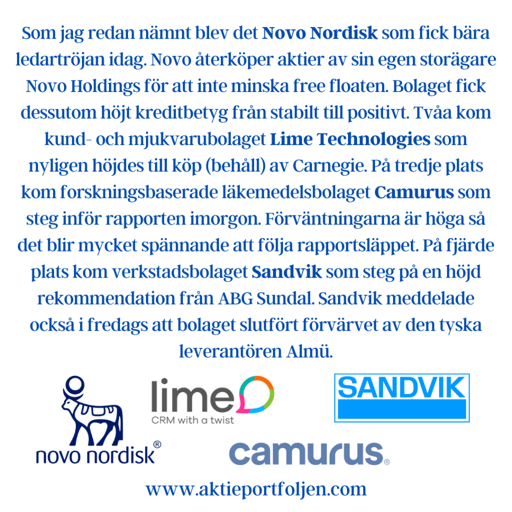 Som jag redan nämnt blev det Novo Nordisk som fick bära ledartröjan idag. Novo återköper aktier av sin egen storägare Novo Holdings för att inte minska free floaten. Bolaget fick dessutom höjt kreditbetyg från stabilt till positivt. Tvåa kom kund- och mjukvarubolaget Lime Technologies som nyligen höjdes till köp (behåll) av Carnegie. På tredje plats kom forskningsbaserade läkemedelsbolaget Camurus som steg inför rapporten imorgon. Förväntningarna är höga så det blir mycket spännande att följa rapportsläppet. På fjärde plats kom verkstadsbolaget Sandvik som steg på en höjd rekommendation från ABG Sundal. Sandvik meddelade också i fredags att bolaget slutfört förvärvet av den tyska leverantören Almü.