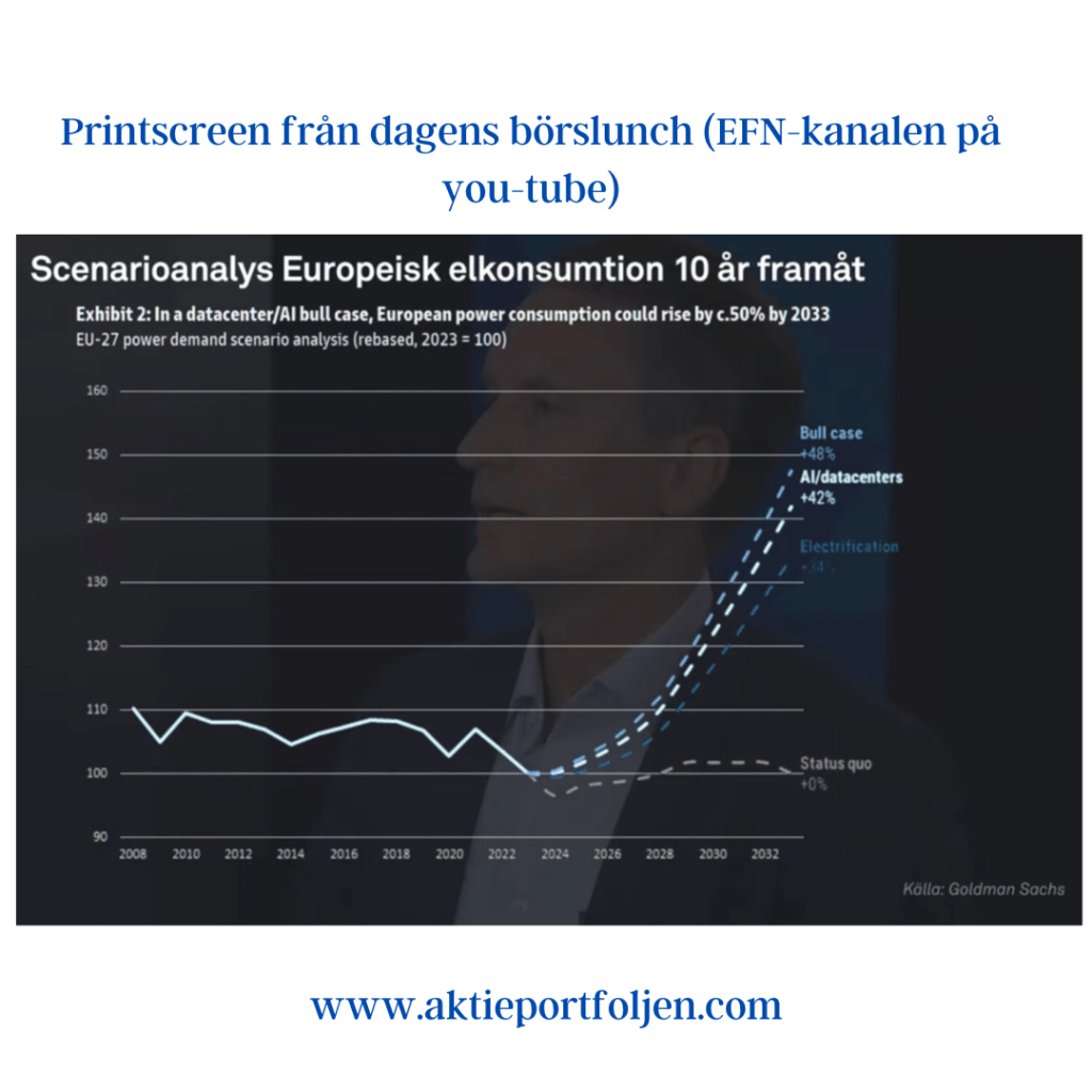 Jag har bestämt mig för att inkludera SaltX i laguppställningen trots att bolaget avviker från regelboken fundamentalt, däremot är trenden oslagbar. Det innebär att det är fullt lag på plan. Eftersom jag är överlikvid kan jag öka i befintliga innehav, men väljer en annan väg. Jag är intresserad av att investera i ren energi. AI-trenden med uppbyggande av datacenter och elektrifieringen utan fossila bränslen inom industriprocesser kommer att mångdubbla vårt energibehov i en nära framtid. Bara det europeiska energibehovet beräknas öka med cirka 50% inom tio år enligt en diskussion i Börslunch idag. Se printscreen från programmet. Efter hajpen 2021/22 har aktier i bolag som levererar förnybar energi haft det motigt, men indexen börjar lyfta över MA200 nu. Jag har därför börjat ta position i iShares Global Clean Energy som placerade sig på fjärde plats på dagens Top 15.