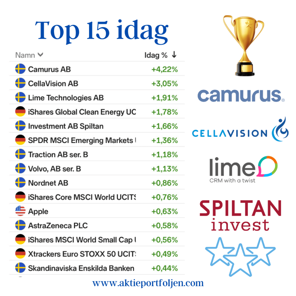 Det räckte att USAs PCE-inflation kom in enligt förväntningarna för hålla börshumöret på den positiva sidan även om börsuppgången idag avmattades innan stängning. Kronan fortsatte stärkas gentemot både euron och dollarn vilket pressade utlandsinnehaven. Precis som i fredags toppar idag två hälsovårdsbolag med det forskningsbaserade läkemedelsbolaget Camurus som behåller ledartröjan. På andra plats kommer blodanalysbolaget Cellavision följd av mjukvarubolaget Lime Technologies och investmentbolaget Spiltan. För topptrion hittar jag inga specifika nyheter men Spiltan meddelade idag ett förvärv av 47 procent av aktierna i Scandinavian Crusher Partner (SCP) som tillhandahåller maskiner, komponentdelar och service till stenkrossningsbranschen. Bolaget har under senaste räkenskapsåret en omsättning på 70 miljoner kronor med ett rörelseresultat på 11 miljoner kronor.