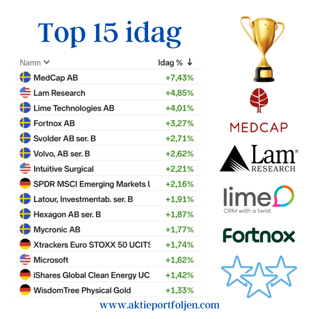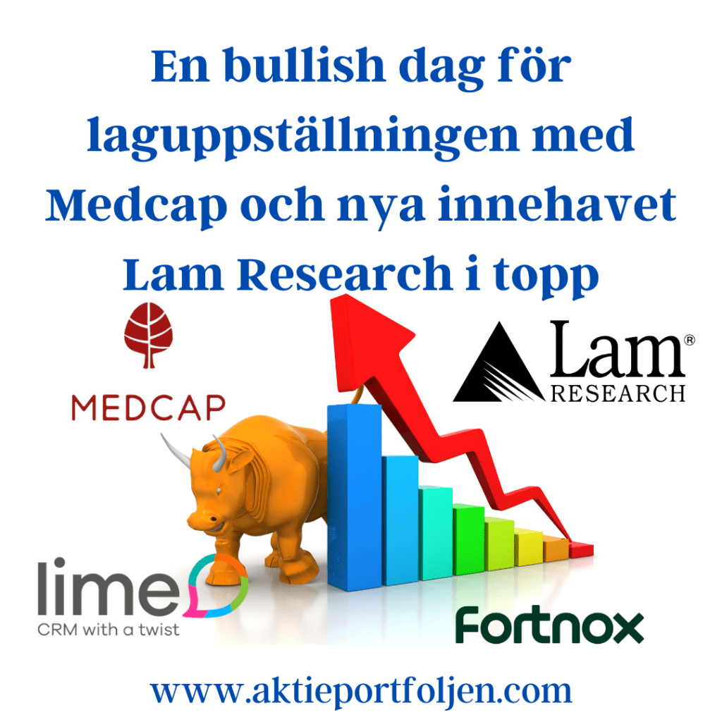 Det var mest muntert på börserna idag, Stockholmsbörsen stängde på +0,85% och laguppställningen fick en riktigt bra dag med hela 21 innehav som stängde över en procent. Ledartröjan gick till rusande medicinteknikbolaget Medcap som fortsätter trenda bra efter ett starkt förstakvartal. På andra plats ligger i detta nu amerikanska Lam Research som jag plockade in från avbytarbänken igårkväll. Teknik- och halvledarbolag går starkt på Wall Street ikväll. Företaget leverar wafertillverknings-utrustning och relaterade tjänster till halvledarindustrin. Prognoserna framåt för bolaget ser lovande ut. På tredje och fjärde plats kom mjukvarubolaget Lime Technologies och affärssystembolaget Fortnox.