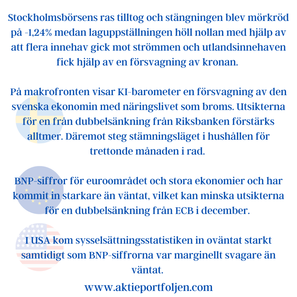 På makrofronten visar KI-barometer en försvagning av den svenska ekonomin med näringslivet som broms. Utsikterna för en från dubbelsänkning från Riksbanken förstärks alltmer. Däremot steg stämningsläget i hushållen för trettonde månaden i rad.