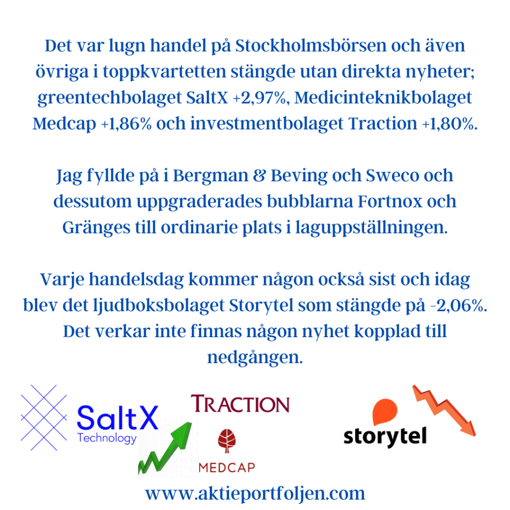 Det var lugn handel på Stockholmsbörsen och även övriga i toppkvartetten stängde utan direkta nyheter; greentechbolaget SaltX +2,97%, Medicinteknikbolaget Medcap +1,86% och investmentbolaget Traction +1,80%.