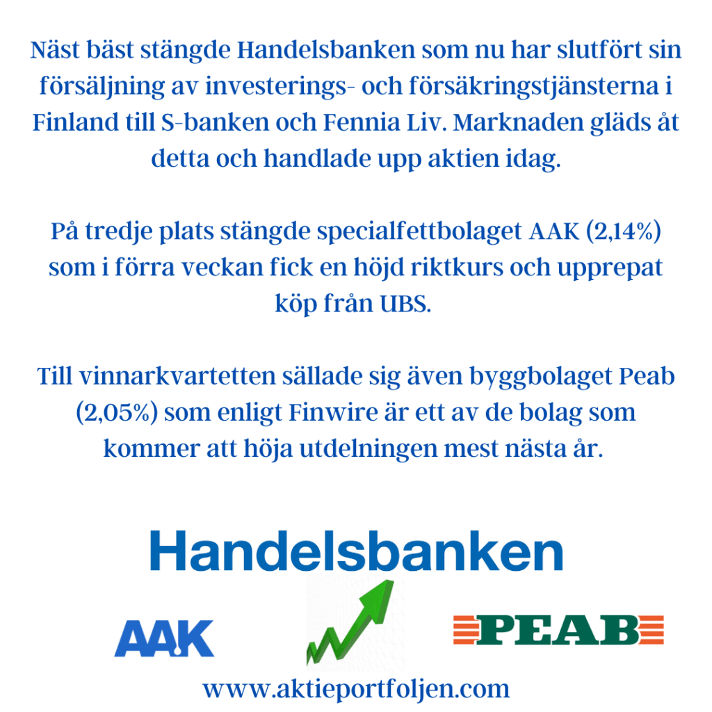 Näst bäst stängde Handelsbanken som nu har slutfört sin försäljning av investerings- och försäkringstjänsterna i Finland till S-banken och Fennia Liv. Marknaden gläds åt detta och handlade upp aktien idag.