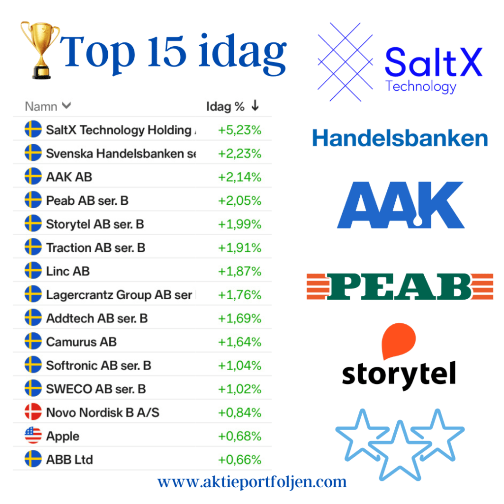 Laguppställningen gjorde återigen ett fantastiskt jobb och ledartröjan gick till greentechbolaget SaltX (+5,23) som gick bäst utan direkta nyheter för dagen. Det tål att upprepas att SaltX är laguppställningens outsider och ligger utanför regelboken. SaltX elektrifieringsteknik kan eliminera koldioxidutsläppen inom bl a cementindustrin som står för 8% av de globala utsläppen. Lyckas bolaget med kommersialiseringsprocessen kan det bli riktigt bra för miljö och ekonomi, men risken är hög och aktieägarna får uppleva en volatil resa.