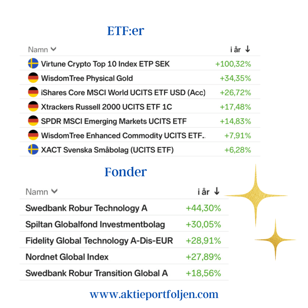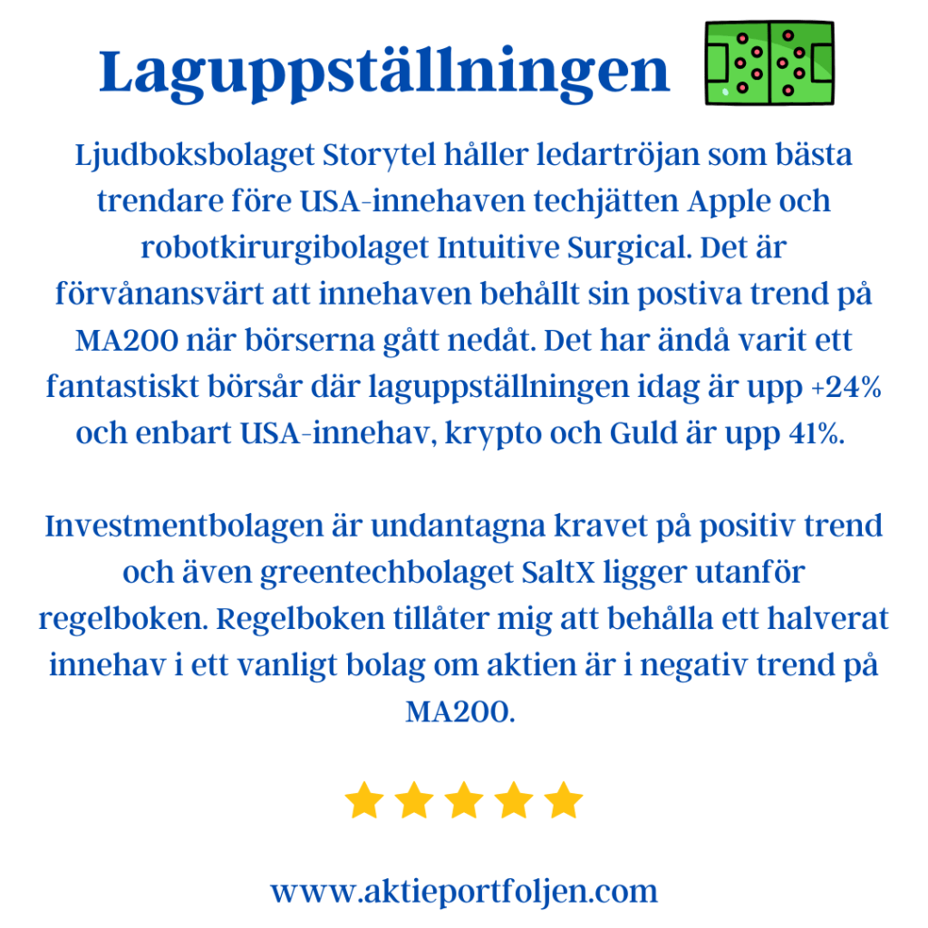 Ljudboksbolaget Storytel håller ledartröjan som bästa trendare före USA-innehaven techjätten Apple och robotkirurgibolaget Intuitive Surgical. Det är förvånansvärt att innehaven behållt sin postiva trend på MA200 när börserna gått nedåt. Det har ändå varit ett fantastiskt börsår där laguppställningen idag är upp +24% och enbart USA-innehav, krypto och Guld är upp 41%.