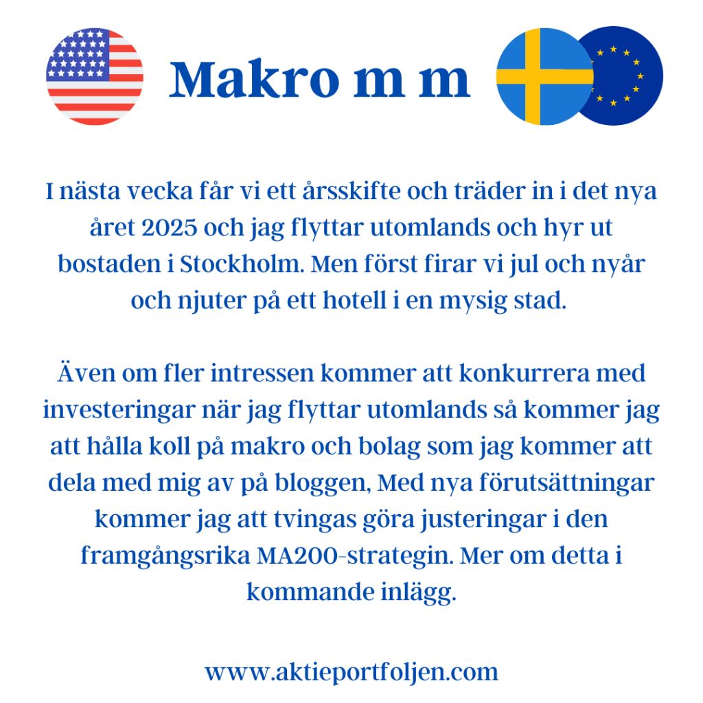 Även om fler intressen kommer att konkurrera med investeringar när jag flyttar utomlands så kommer jag att hålla koll på makro och bolag som jag kommer att dela med mig av på bloggen, Med nya förutsättningar kommer jag att tvingas göra justeringar i den framgångsrika MA200-strategin. Mer om detta i kommande inlägg.
