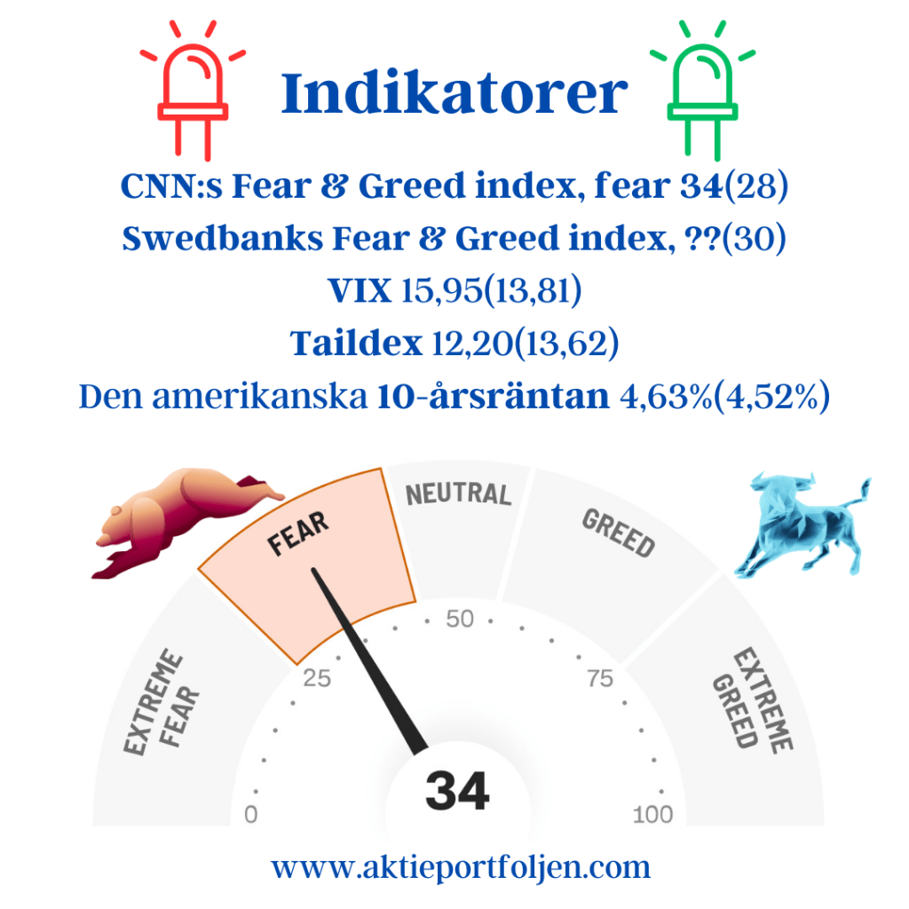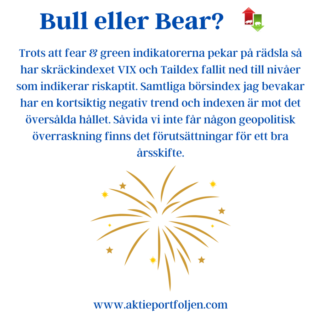 Trots att fear & green indikatorerna pekar på rädsla så har skräckindexet VIX och Taildex fallit ned till nivåer som indikerar riskaptit. Samtliga börsindex jag bevakar har en kortsiktig negativ trend och indexen är mot det översålda hållet. Såvida vi inte får någon geopolitisk överraskning finns det förutsättningar för ett bra årsskifte.