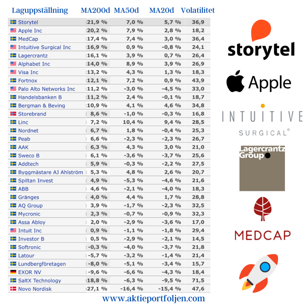 Ljudboksbolaget Storytel håller ledartröjan som bästa trendare före techjätten Apple och medicinteknikbolaget Medcap.
